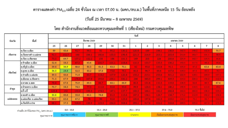 ฝุ่น PM 2.5 ภาคเหนือหลายพื้นที่ยังหนัก "อ.แม่สาย- อ.ลี้ เกินมาตรฐานในระดับสีแดง ติดต่อกันมา 15 วัน ขณะที่ "แม่ฮ่องสอน" พบจุดความร้อนเกือบ 200 จุด วันนี้ (8 เม.ย.2569) สำนักงานสิ่งแวดล้อมและควบคุมมลพิษที่ 1 (เชียงใหม่) ออกประกาศฉบับที่ 13 ในพื้นที่จังหวัด เชียงใหม่ เชียงราย ลำพูน แม่ฮ่องสอน พบปริมาณฝุ่นละอองขนาดเล็กกว่า 2.5 ไมครอน หรือ PM 2.5 เฉลี่ย 24 ชั่วโมง ณ เวลา 07.00 น. มีค่าระหว่าง 63.4 – 171.2 มคก./ลบ.ม. คุณภาพอากาศอยู่ในเกณฑ์ระดับ เริ่มมีผลกระทบต่อสุขภาพ (สีส้ม) ถึง มีผลกระทบต่อสุขภาพ (สีแดง)
