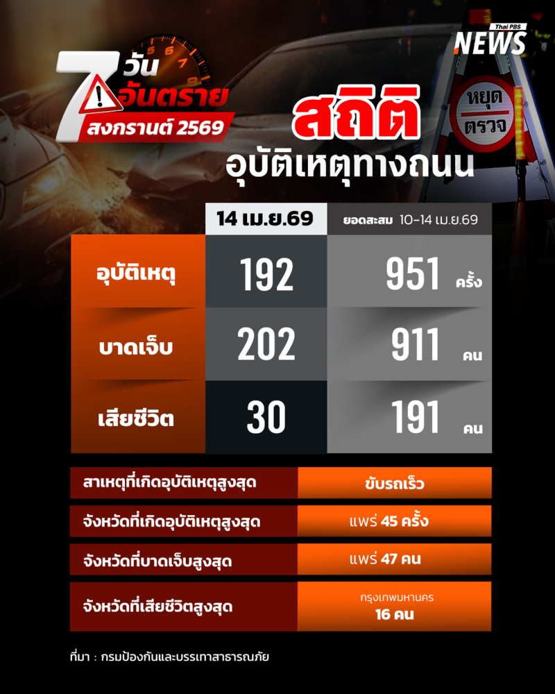 สรุปอุบัติเหตุทางถนนสะสมในช่วง 5 วันของการรณรงค์ (10 – 14 เม.ย.2569) เกิดอุบัติเหตุรวม 951 ครั้ง ผู้บาดเจ็บ รวม 911 คน ผู้เสียชีวิต รวม 191 คน จังหวัดที่เกิดอุบัติเหตุสะสมสูงสุดได้แก่ แพร่ (45 ครั้ง) จังหวัดที่มีผู้บาดเจ็บสะสมสูงสุด ได้แก่ แพร่ (47 คน) จังหวัดที่มีผู้เสียชีวิตสะสมสูงสุด ได้แก่ กรุงเทพมหานคร (16 คน)