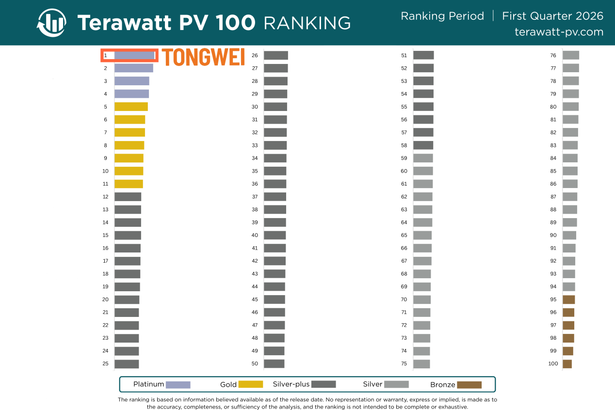 Tongwei ได้รับการจัดอันดับให้เป็ นผู้ผลิตแผงโซลาร์เซลล์อันดับ 1 ของโลกในรายชื่อ Terawatt PV 100 ซงตอกยาความเปนผนา ของบรษทในหวงโซคณคาการผลตพลงงานแสงอาทตยระดบโลกในการประกาศผลประกอบการไตรมาสท 1 ปี 2569 บริษัท Tongwei สามารถรกษาตาแหนงสงสดและไดรบคะแนนระดบ Platinum ซึ่งเป็ นคะแนนสูงสุดในตารางคะแนน