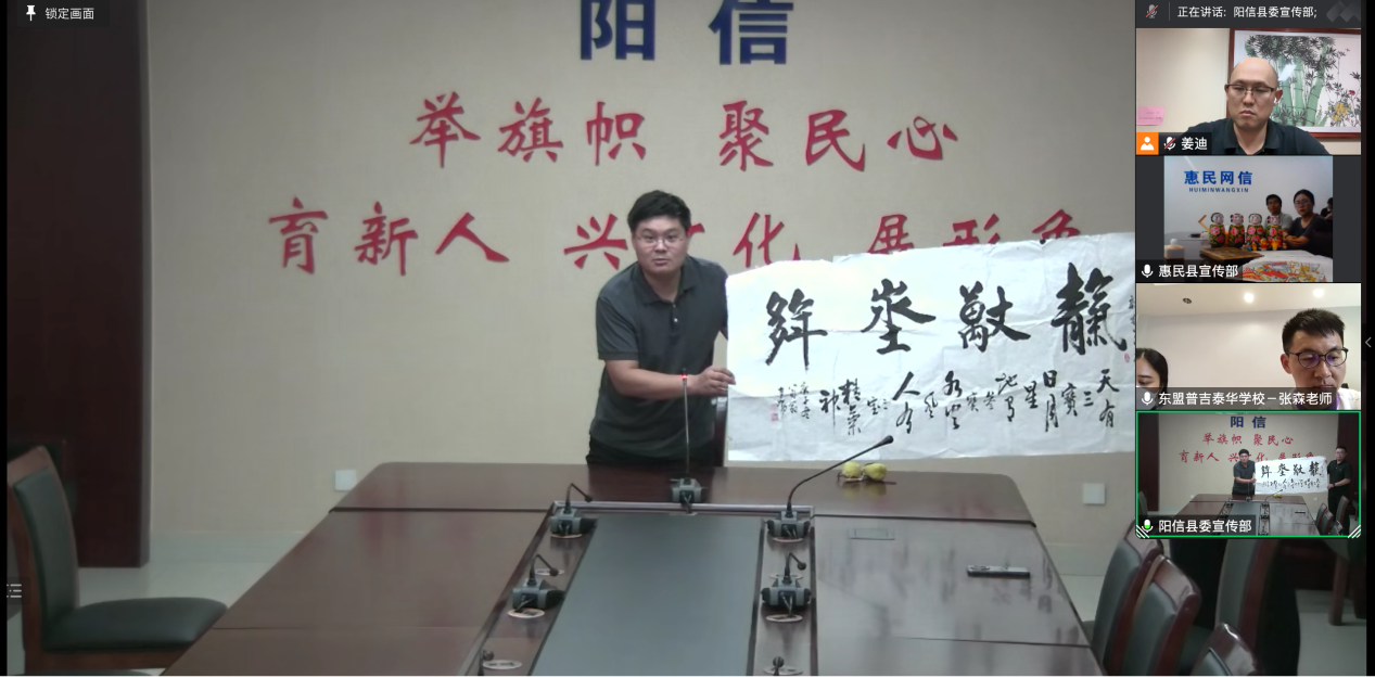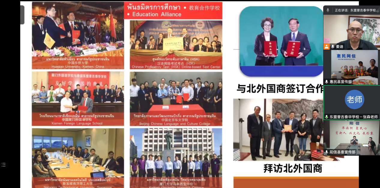 โดยท่านเฉิน ลุ้ย ผู้อำนวยการศูนย์แนะแนวอารยธรรมยุคใหม่และผู้อำนวยการสำนักงานประชาสัมพันธ์ของมณฑลหยางซิน ,ท่านหลี่ ซินลุ้ย ผู้อำนวยการสำนักงานข่าว,ท่านลู่ เฉาฉุน ผู้อำนวยการสำนักงานประชาสัมพันธ์ของเมืองชิงเหอ มณฑลฮุ่ยหมิน ท่านเจียง ตี๋ สื่อมวลชนจากบริษัทเพิง จวู้ เข้าร่วมการประชุม ด้วยวิธีการวิดีโอคอลกับอาจารย์จาง เซิน จากโรงเรียนภูเก็ตไทยอาเซียนวิทยา ทั้งสองฝ่ายได้มีการพูดคุยและแลกเปลี่ยนกันในเรื่อง "การบริจาคมรดกทางวัฒนธรรมที่จับต้องไม่ได้"และ"การเรียนการสอนออนไลน์ เพื่อสร้างห้องเรียนร่วมกัน" และเรื่องอื่นๆในรูปแบบการสนทนา เพื่อทำการแลกเปลี่ยนความคิดเห็น