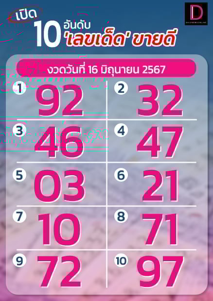 เมื่อจัดลำดับความนิยมของเลขดัง 10 อันดับ พบมีดังนี้ อันดับ 1 เลข 92 อันดับ 2 เลข 32 อันดับ 3 เลข 46 อันดับ 4 เลข 47 อันดับ 5 เลข 03 อันดับ 6 เลข 21 อันดับ 7 เลข 10 อันดับ 8 เลข 71 อันดับ 9 เลข 72 และ 10 เลข 97