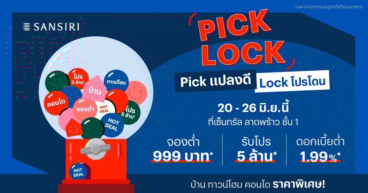 แสนสิริ เสริมทัพมาตรการกระตุ้นเศรษฐกิจผ่านภาคอสังหาริมทรัพย์ กระตุ้นกำลังซื้อ Real Demand จัดอีเวนต์ใหญ่ “PICK LOCK” Pick แปลงดี Lock โปรโดน พิถีพิถึนคัดสรรยูนิตฮอตทำเลฮิตของการอยู่อาศัย ทั้งบ้าน คอนโดมิเนียม ทาวน์โฮม รวม 36 โครงการ พร้อมรับส่วนลดสูงสุด 5 ล้านบาท วันที่ 20-26 มิถุนายนนี้ ที่เซ็นทรัลลาดพร้าว