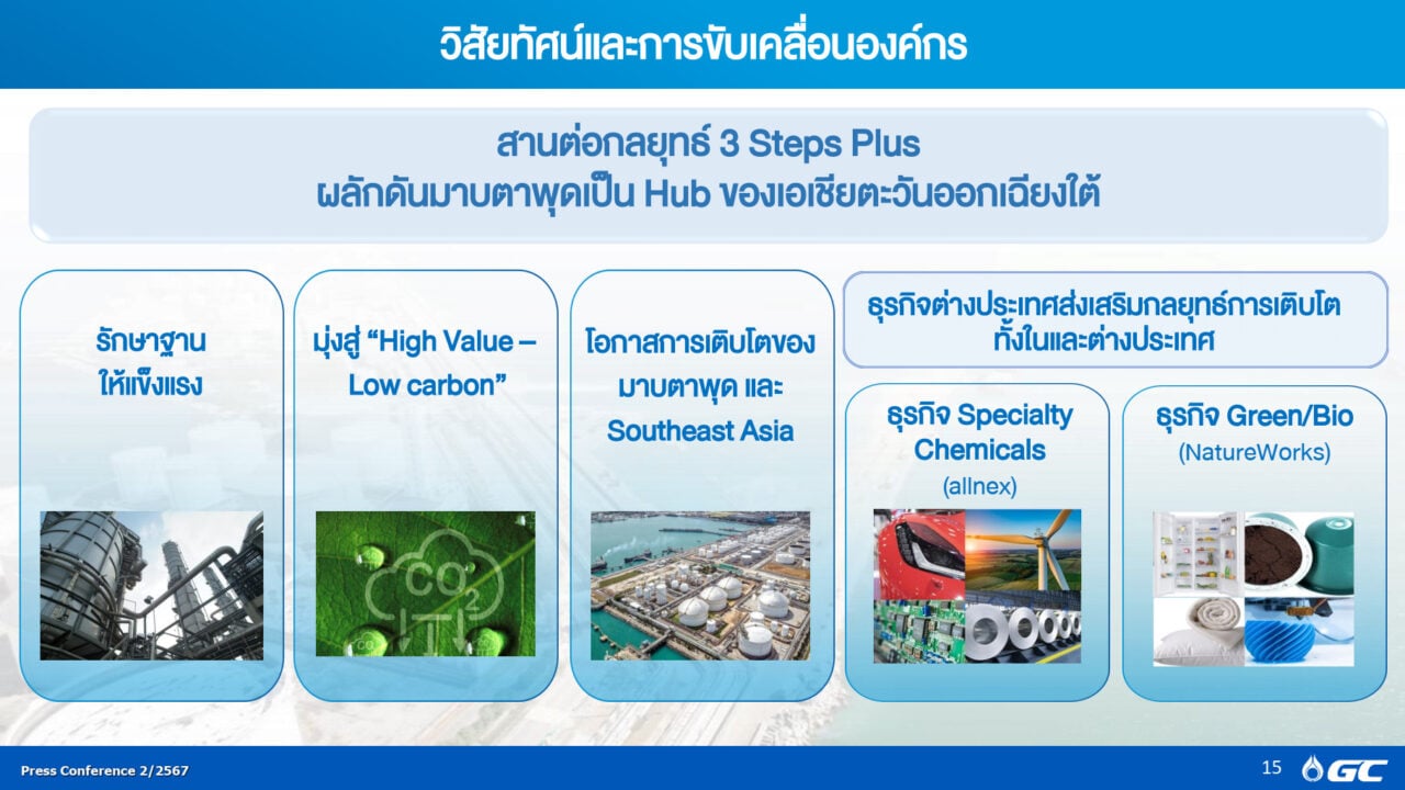 2. ยกระดับสร้างโอกาสการลงทุนในมาบตาพุด รองรับการขยายตัวการลงทุนและเศรษฐกิจในเอเชียตะวันออกเฉียงใต้ ด้วยสภาวะเศรษฐกิจที่กำลังฟื้นตัว และคาดว่าภูมิภาคเอเชียตะวันออกเฉียงใต้จะมีรายได้ประชาชาติ (จีดีพี) เติบโต ที่ 4.6% จีซีจึงวางแผนสรรหา และพัฒนา Strategic Partnership ดึงดูดการลงทุนธุรกิจ High Value/ Specialty Chemicals สนับสนุนการลงทุนในอุตสาหกรรมต่าง ๆ ที่มีแนวโน้มจะสร้างฐานการผลิตในเอเชียตะวันออกเฉียงใต้
