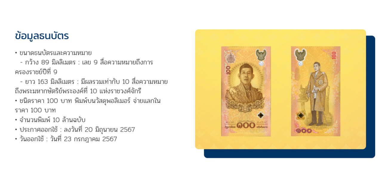 ความน่าสนใจ จุดเด่น : ธนบัตรที่ระลึกเฉลิมพระเกียรติพระบาทสมเด็จพระเจ้าอยู่หัว รัชกาลที่ 10 เนื่องในโอกาสพระราชพิธีมหามงคลเฉลิมพระชนมพรรษา 6 รอบ 72 พรรษา 28 กรกฎาคม 2567