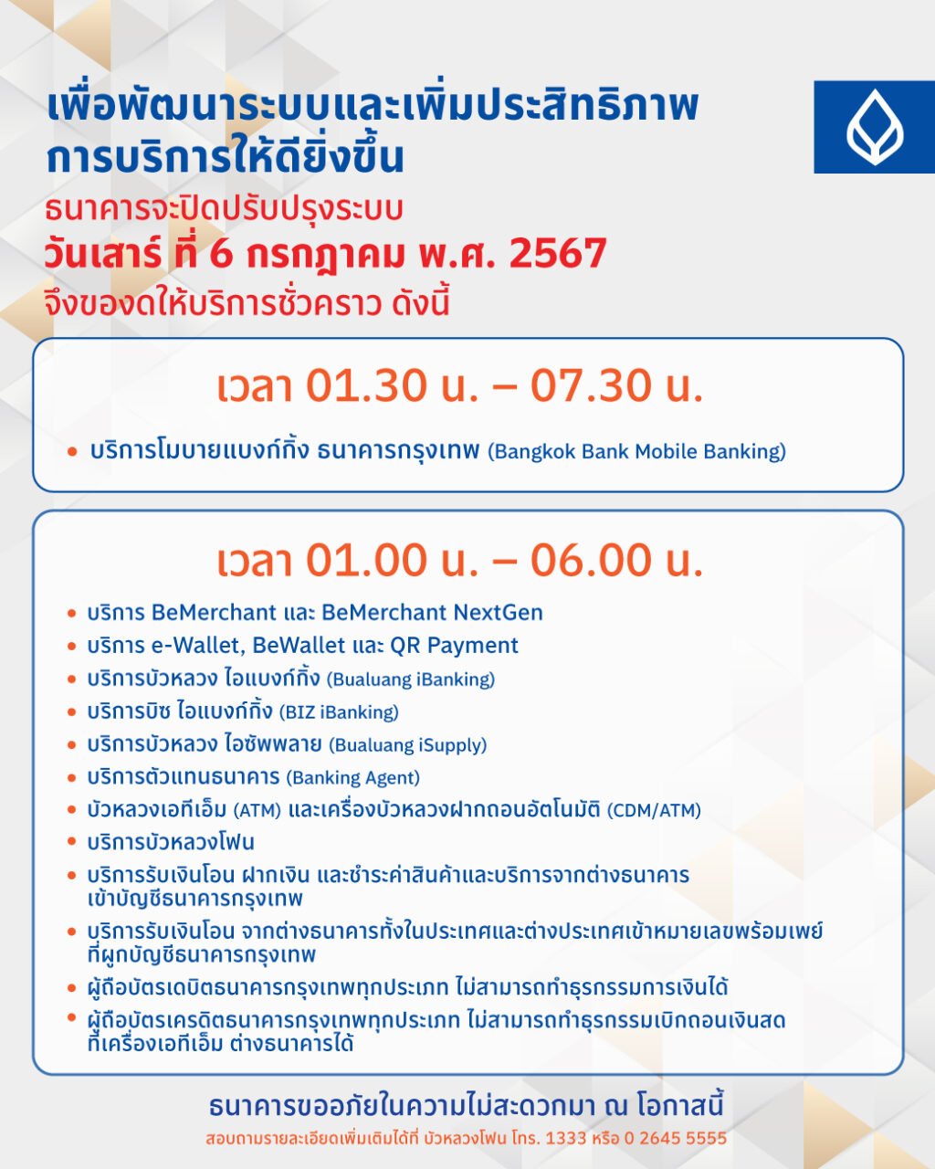 ธนาคารขออภัยลูกค้าทุกท่านสำหรับความไม่สะดวกในครั้งนี้ด้วย โดยลูกค้าทุกท่านสามารถติดตามข้อมูลข่าวสารได้จากสื่อประชาสัมพันธ์ของธนาคารกรุงเทพทุกช่องทาง ได้แก่ www.bangkokbank.com,Bangkok Bank LINE Official เพจ Facebook-BangkokBankOfficial หรือสอบถามรายละเอียดเพิ่มเติมได้ที่ บัวหลวงโฟน โทร.1333 หรือ 0-2645-5555