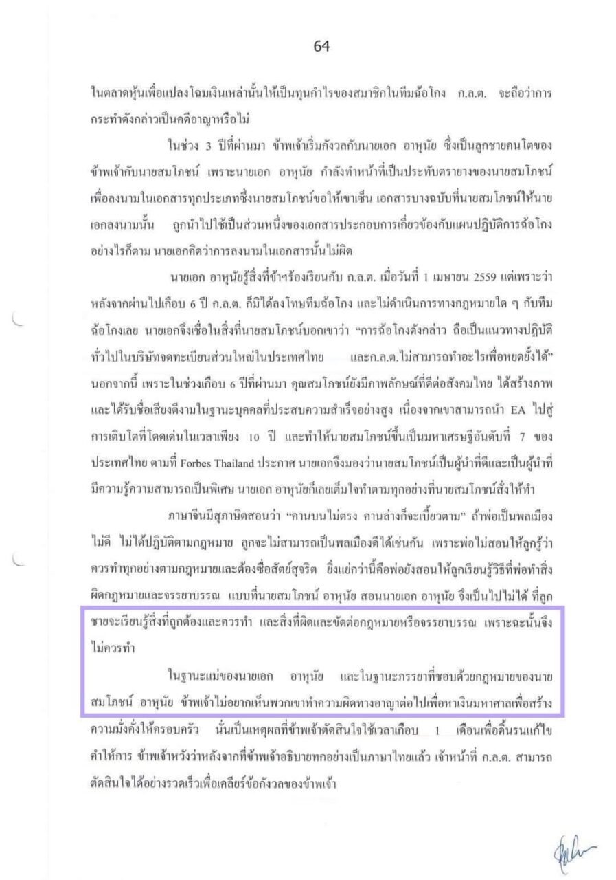 “ในช่วง 3 ปีที่ผ่านมา ข้าพเจ้าเริ่มกังวลกับนายเอก อาหุนัย ซึ่งเป็นลูกชายคนโตของ ข้าพเจ้ากับนายสมโภชน์ เพราะนายเอก อาหนัย กำลังทำหน้าที่เป็นประทับตรายางของนายสมโภชน์ เพื่อลงนามในเอกสารทุกประเภทซึ่งนายสมโภชน์ขอให้เขาเซ็น เอกสารบางฉบับที่นายสมโภชน์ให้นายเอกลงนามนั้น ถูกนำไปใช้เป็นส่วนหนึ่งของเอกสาร ประกอบการเกี่ยวข้องกับแผนปฏิบัติการฉ้อโกง อย่างไรก็ตาม นายเอกคิดว่าการลงนามในเอกสารนั้นไม่ผิด