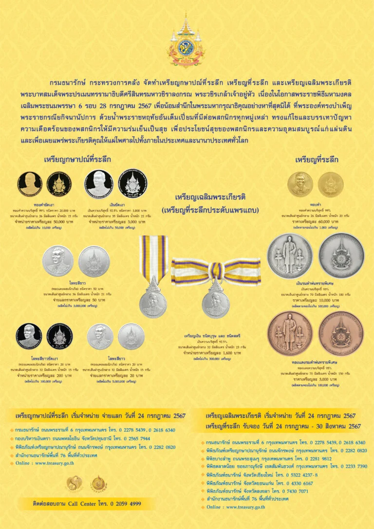 “ธนารักษ์” เปิดจำหน่าย จ่ายแลก และรับจองเหรียญกษาปณ์ที่ระลึก เหรียญที่ระลึก และเหรียญเฉลิมพระเกียรติ พระบาทสมเด็จพระปรเมนทรรามาธิบดีศรีสินทรมหาวชิราลงกรณ พระวชิรเกล้าเจ้าอยู่หัว เนื่องในโอกาสพระราชพิธีมหามงคลเฉลิมพระชนมพรรษา 6 รอบ 28 กรกฎาคม 2567
