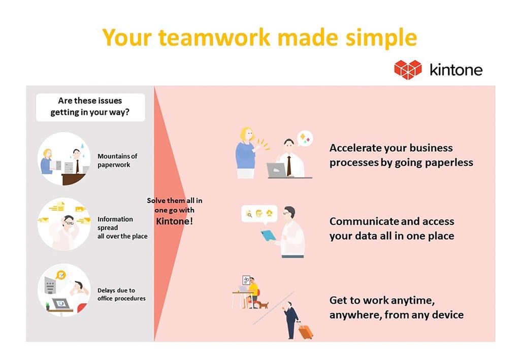 “Kintone เป็นผู้สร้างโซลูชั่นพื้นที่การทำงานแบบ DIY และเป็นส่วนสำคัญที่จะเข้ามาเปลี่ยนโฉมวงการธุรกิจไทย ตอบสนองไปตามความต้องการของผู้ใช้งาน ผ่านการสร้างแอปพลิเคชันที่สามารถจัดการด้วยตนเองได้แบบครบวงจรแบบ all-in-one พร้อมออกแบบ Workflow ในองค์กรได้แบบไม่จำเป็นต้องเขียนโปรแกรม (no-coding) ให้ยุ่งยาก เชื่อมต่อทุกระบบผ่าน Cloud Service ทำให้ไม่ว่าพนักงานจะอยู่ที่สำนักงาน บ้าน หรือประชุมกับลูกค้าก็สามารถเข้าถึงระบบการทำงานอย่างมีประสิทธิภาพได้เต็มที่”