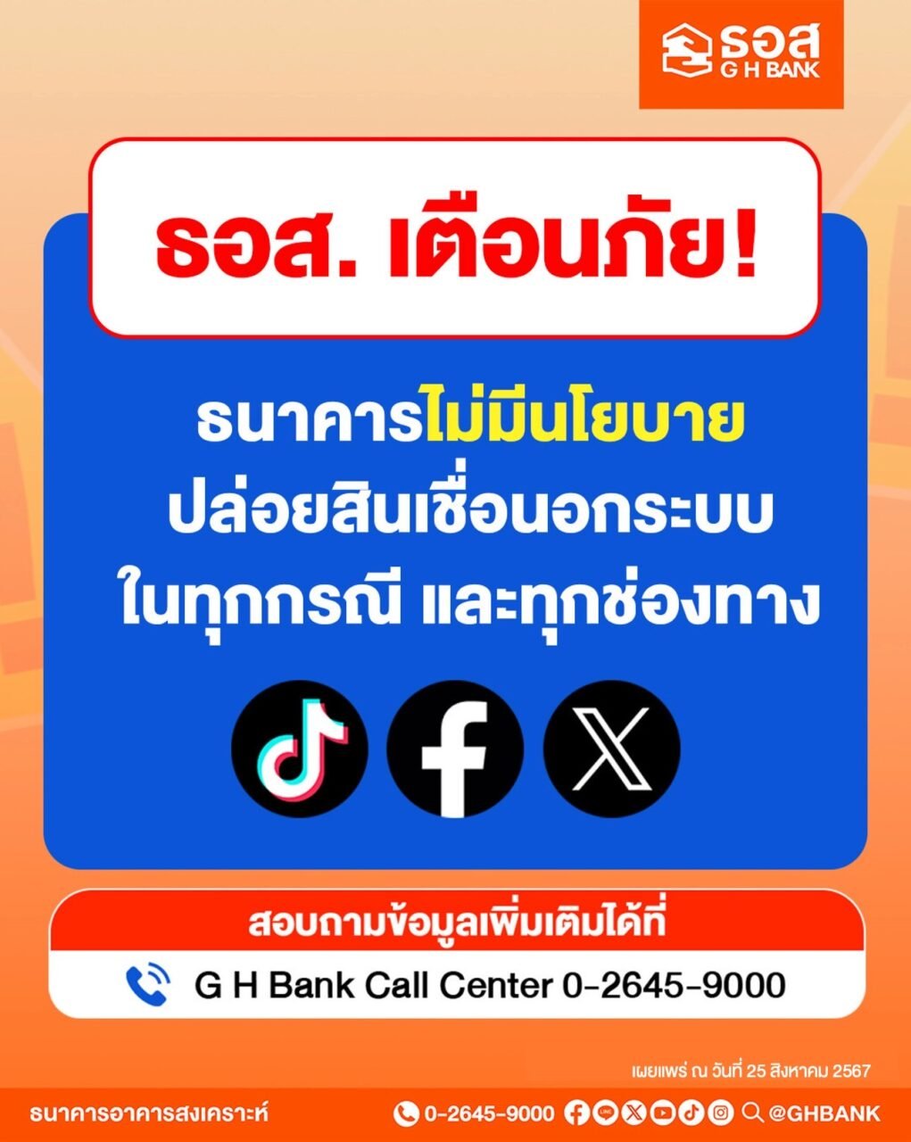 ธนาคารอาคารสงเคราะห์ (ธอส.) ขอแจ้งเตือนภัยกรณีมีกลุ่มมิจฉาชีพแอบอ้างใช้บัญชีปลอมและตัดต่อคลิปวิดีโอประชาสัมพันธ์การขอสินเชื่อของธนาคาร เพื่อใช้ในการโฆษณาเงินกู้นอกระบบ บนแพลตฟอร์มออนไลน์ต่าง ๆ โดย ธอส. ขอยืนยันว่า ไม่มีนโยบายในการปล่อยสินเชื่อนอกระบบ ดังนั้น จึงไม่มีส่วนเกี่ยวข้องกับการดำเนินการทั้งหมดนี้ อย่างไรก็ตามธนาคารอยู่ระหว่างดำเนินการทางกฎหมายกับกลุ่มมิจฉาชีพที่ตัดต่อคลิปวิดีโอดังกล่าว