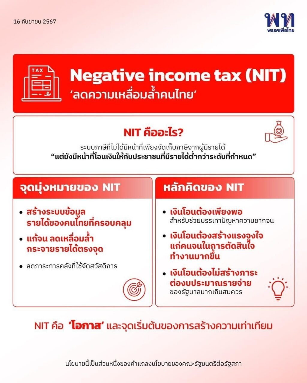 รายละเอียดเพิ่มเติม “พรรคเพื่อไทย” ระบุว่า Negative income tax (NIT) “ลดความเหลื่อมล้ำคนไทย” คําแถลงนโยบายของคณะรัฐมนตรี นางสาวแพทองธาร ชินวัตร นายกรัฐมนตรี แถลงต่อรัฐสภา 12 กันยายน 2567
