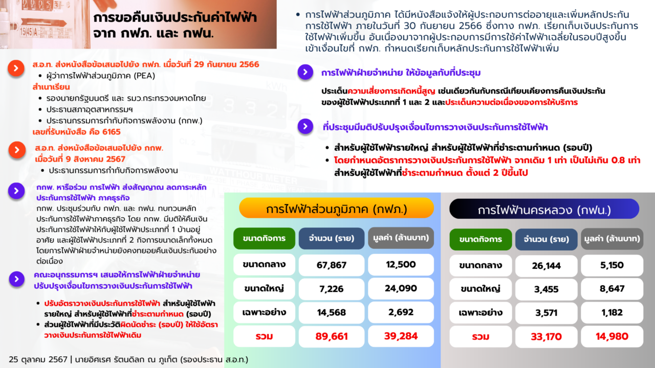 นายอิศเรศ รัตนดิลก ณ ภูเก็ต รองประธานสภาอุตสาหกรรมแห่งประเทศไทย (ส.อ.ท.) เปิดเผยถึงมติคณะกรรมการกำกับกิจการพลังงาน (กกพ.) เห็นชอบลดเงื่อนไขวางเงินประกันใช้ไฟฟ้าสำหรับผู้ใช้ไฟฟ้ารายใหญ่ ได้แก่ ผู้ใช้ไฟฟ้าประเภท 3 กิจการขนาดกลาง ประเภท 4 กิจการขนาดใหญ่ และประเภท 5 กิจการเฉพาะอย่าง ที่มีประวัติการชำระค่าไฟฟ้าดี เริ่มรอบบิลต้นปี 68 ว่า ต้องขอบคุณทางกกพ.ที่มีมติลดวงเงินหลักประกันการใช้ไฟฟ้า แต่เอกชนยังมองว่า วงเงินที่ลดลงจากเดิม 1 เท่า เหลือ 0.8 เท่า ยังน้อยเกินไป ตามข้อเสนอของส.อ.ท.ไม่ควรเกิน 0.5 เท่า เนื่องจากวงเงินที่วางหลักประกันกับการไฟฟ้านครหลวง และการไฟฟ้าส่วนภูมิภาค เป็นเงินของภาคเอกชนเองสูงถึง 54,264 ล้านบาท จำนวน 122,831 ราย ซึ่งเป็นเงินของภาคเอกชนเอง ถ้าคืนมาให้ผู้ประกอบการหมุนเวียนธุรกิจ จะทำให้เสริมสภาพคล่อง ในภาวะภาคธุรกิจอ่อนแอจากภัยคุกคามรอบด้านได้
