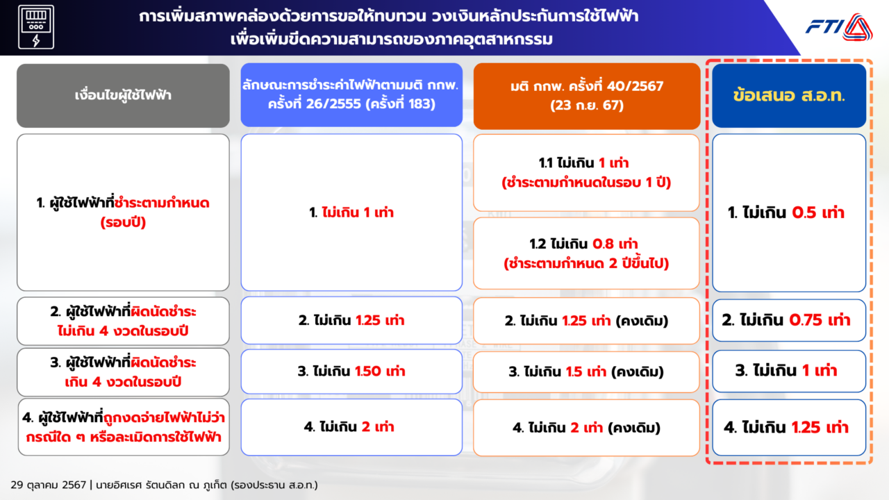 ทั้งนี้ส.อ.ท.จะยื่นหนังสือกลับไปให้รัฐบาล และกกพ.พิจารณาอีกครั้ง โดยยืนยันข้อเสนอเดิม คือ ผู้ใช้ไฟฟ้าที่ชำระตามกำหนดในรอบปี คือ กรณีชำระตามกำหนดในรอบ 1 ปี ล่าสุดกกพ.ปรับลดวงเงินค้ำประกันเป็น 1 เท่า ,กรณีชำระตามกำหนด 2 ปีขึ้นไป เหลือไม่เกิน 0.8 เท่า ซึ่งข้อเสนอส.อ.ท.ขอเหลือไม่เกิน 0.5 เท่า ส่วนกรณีผู้ใช้ไฟฟ้าที่ผิดนัดชำระไม่เกิน 4 งวดในรอบปี ล่าสุดกกพ. ยังยืนยันให้วางหลักประกัน 1.25 เท่า แต่ส.อ.ท. ขอให้เหลือไม่เกิน 1 เท่า ขณะที่กลุ่มผู้ใช้ไฟฟ้าที่ถูกงดจ่ายไฟฟ้าไม่ว่ากรณีใดๆ เดิมไม่เกิน 2 เท่า ขอปรับเป็นไม่เกิน 1.25 เท่า