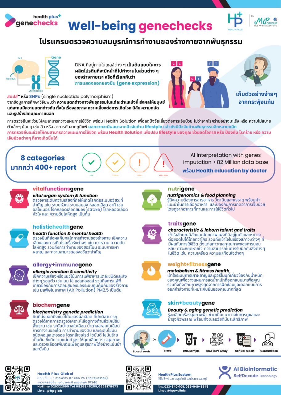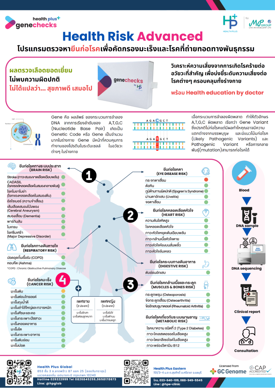 ด้วยการนำเทคโนโลยีและนวัตกรรมด้าน Healthcare มาเสริมสร้างความแข็งแกร่งให้กับ Wellness Ecosystem ของไทย MP Group มุ่งมั่นที่จะรองรับ Medical Tourism ของนักท่องเที่ยวจากทั่วทุกมุมโลก โดยเฉพาะการตรวจและดูแลสุขภาพเชิงป้องกัน (Preventive Healthcare) ผ่านการตรวจวินิจฉัยจากข้อมูลทางพันธุกรรม ด้วยการตรวจยีน genechecks สามารถตรวจหาความเสี่ยงโรคต่างๆ ได้แก่ โรคมะเร็ง โรคทางระบบประสาท โรคหลอดเลือดหัวใจ และโรคเกี่ยวกับระบบเผาผลาญ ด้วยแพคเกจ Health Risk Advance