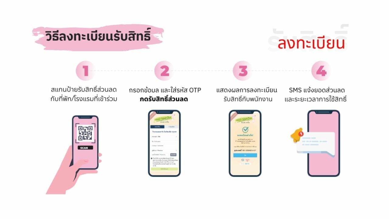 1.สแกนป้ายรับสิทธิส่วนลดกับที่พัก/โรงแรมที่เข้าร่วม