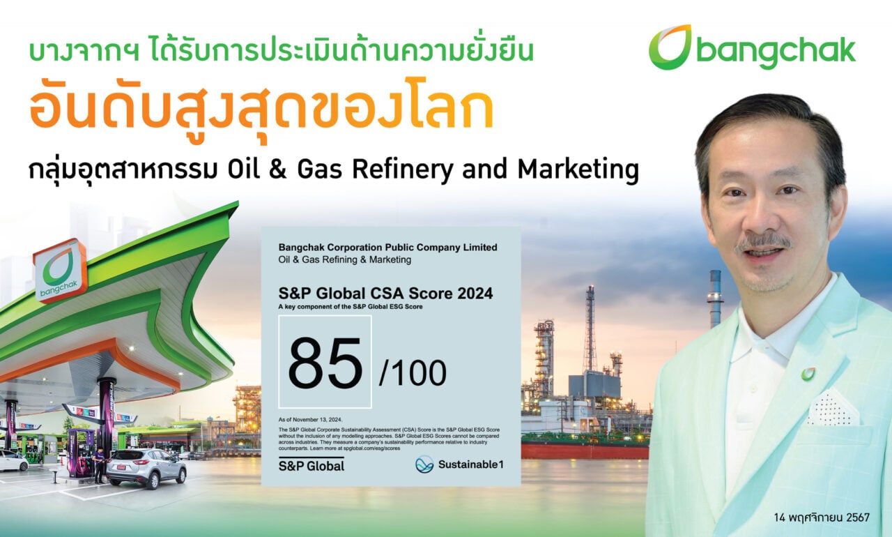บางจากฯ ได้รับการประเมินจาก S&P Global 2024 ด้านความยั่งยืนอันดับสูงสุดของโลก ในกลุ่มอุตสาหกรรม Oil & Gas Refinery and Marketing คะแนนรวม 85 คะแนน ตอกย้ำองค์กรแห่งความยั่งยืนระดับสากล