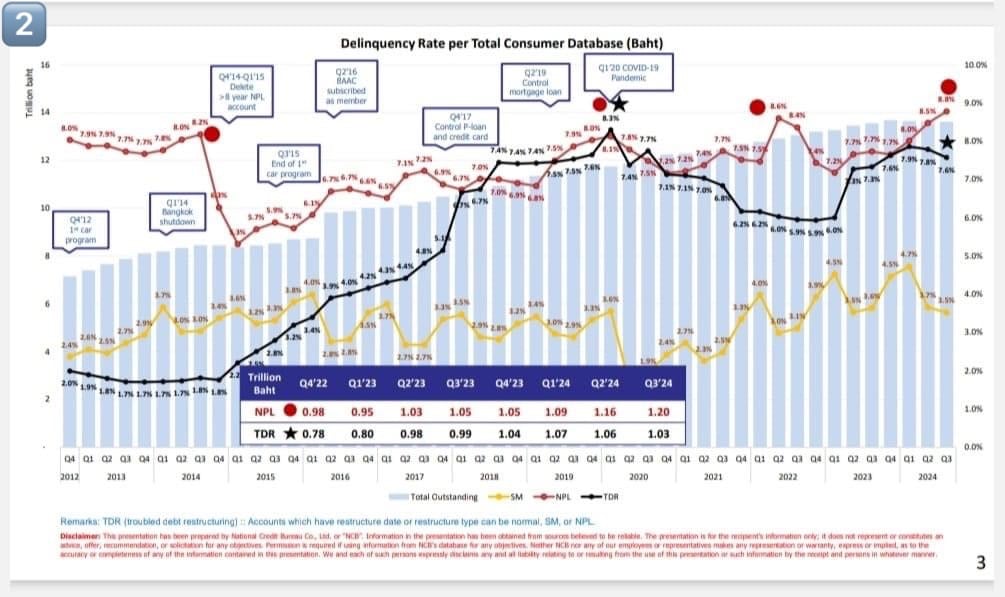 ภาพที่ 2 ระดับของหนี้เสีย หรือ NPL (Non-Performing Loan) ก็เป็นไปตามคาดมาอยู่ที่ประมาณ 1.2 ล้านล้านบาท คิดเป็นสัดส่วน 8.8% ของหนี้รวม 13.6 ล้านล้านบาท คือเส้นสีแดงที่พุ่งขึ้นมาชัดเจนตั้งแต่ไตรมาส 1 ปี 2566 พักฐานไตรมาส 4 ปี 2566 แล้วไปต่อตั้งแต่ปี 2567 พร้อม ๆ กับมาตรการกลับไปสู่ความเป็นปกติ (normalize) เศรษฐกิจค่อย ๆ โตกลับมาอย่างเชื่องช้า มีเรื่องการให้กู้อย่างรับผิดชอบ การแก้หนี้เรื้อรัง และแก้หนี้ครบวงจร ภาพของเส้นหนี้เสียวิ่งจาก 7.7% สู่ 8.8%