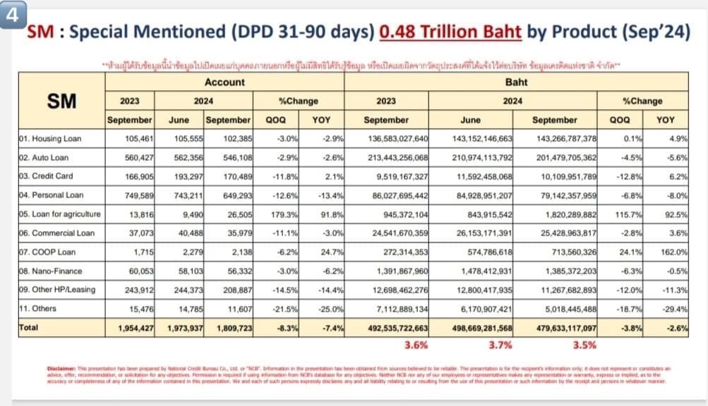 ภาพที่ 4 หนี้กำลังจะเสียหรือหนี้ที่ต้องจับตาเป็นพิเศษ หรือ SM (Special Mention) ยอดคงค้าง Q3 ปี 2567 มาหยุดที่ 4.8 แสนล้านบาทโดยประมาณ ลดลงมาทั้ง YoY และ QoQ