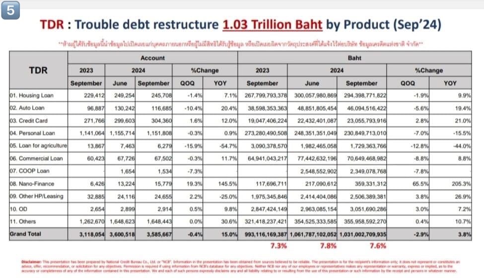 2 ภาพสุดท้าย คือ การปรับปรุงโครงสร้างหนี้ที่มีปัญหา (Troubled Debt Restructuring: TDR) ซึ่งตัวเลขสะสมมาอยู่ที่ 1.03 ล้านล้านบาท คิดเป็นสัดส่วน 7.6% ของ 13.6 ล้านล้านบาท เติบโต QoQ ติดลบประมาณ 3%
