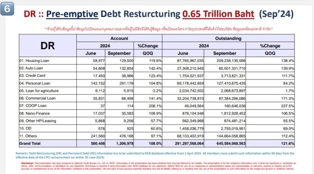 ในส่วนของการปรับปรุงโครงสร้างหนี้เชิงป้องกันก่อนเป็นหนี้เสีย (Debt Restructuring : DR) ยอดสะสมตั้งแต่เมษายน 2567 มาหยุดที่ 1.2 ล้านบัญชี 6.45 แสนล้านบาท