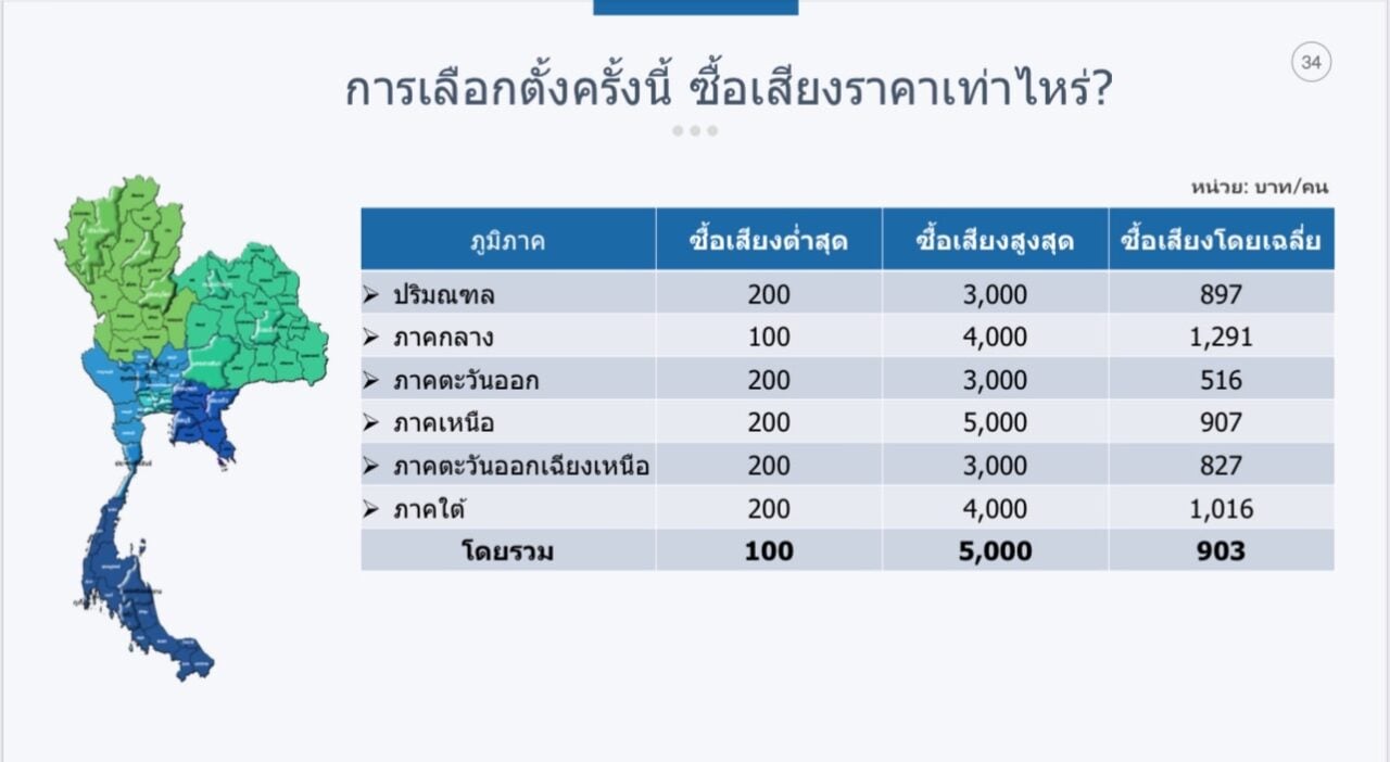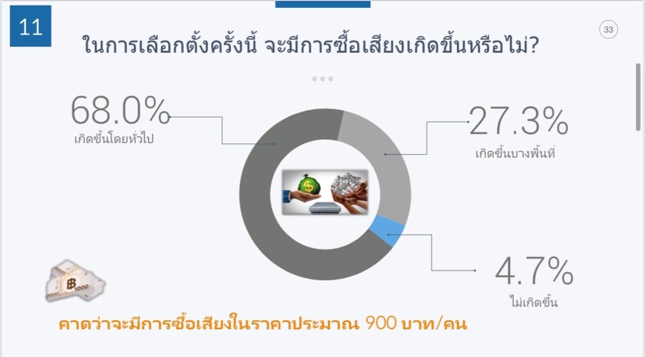 ทั้งนี้ หากผู้มีสิทธิมาใช้สิทธิเลือกตั้ง 40-65% ของจำนวนผู้มีสิทธิทั้งหมดกว่า 28.21 ล้านคน จะมีการซื้อเสียงสูงถึง 10,193-16,564 ล้านบาท ซึ่งผู้ตอบมากถึง 63.7% บอกว่า รับได้หากมีการซื้อเสียง และ 32.7% รับไม่ได้ ขณะที่ 58.7% บอกว่า การซื้อเสียงชักจูงให้เลือกผู้สมัครที่ให้เงินได้ อีก 41.3% บอกไม่ได้ อย่างไรก็ตาม เมื่อถามว่า รับเงินแล้วจะเลือกคนที่จ่ายเงินให้หรือไม่ มากถึง 56% ไม่เลือก และ 44% เลือก แต่หากมีการจ่ายเงินให้เฉลี่ย 2,784 บาท ก็จะเปลี่ยนใจเลือกผู้สมัครคนอื่นได้ เพราะให้เงินมากกว่าคู่แข่ง ทดลองการเปลี่ยนแปลง ต้องการได้เงิน ฯลฯ อีกทั้งผู้ตอบส่วนใหญ่ยังเลือกผู้สมัครที่มีความคุ้นเคย