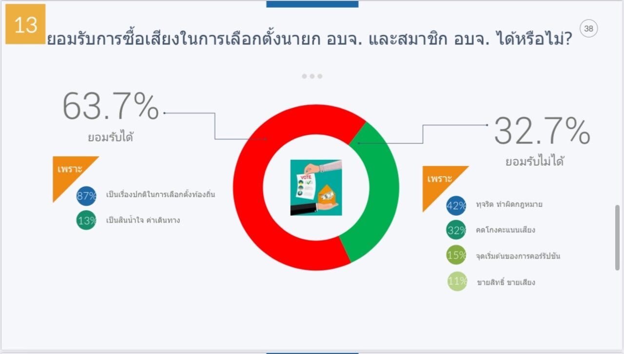“น่าตกใจ เมื่อถามว่า เห็นด้วยหรือไม่หากอบจ.ทุจริตบ้างแต่มีผลงานและทำประโยชน์ให้พื้นที่ มากถึง 40.4% เห็นด้วย อีก 27.6% ไม่เห็นด้วย และ 32% ไม่แน่ใจ และหากพิสูจน์ได้ว่า ผู้สมัครเคยมีประวัติทุจริตจะเลือกหรือไม่ 41% ตอบเลือก,41.2% ไม่เลือก และ 17.8% ไม่แน่ใจ ทั้งๆ ที่ประชาชนรู้ว่า หากเลือกไปแล้วจะส่งผลเสียต่อพื้นที่ ทั้งทำโครงการพัฒนาไม่ตรงกับความต้องการของประชาชน เกิดความเหลื่อมล้ำ งบประมาณถูกใช้อย่างไร้ประสิทธิภาพ ขาดความเชื่อมั่นจากนักลงทุนและนักท่องเที่ยว เสียภาพลักษณ์ของจังหวัด”