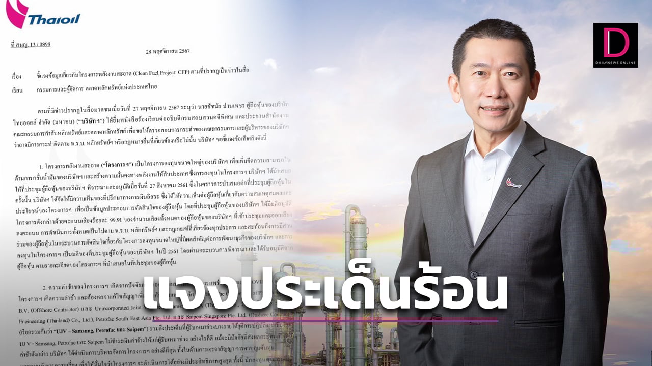 นายบัณฑิต ธรรมประจำจิต ประธานเจ้าหน้าที่บริหารและกรรมการผู้จัดการใหญ่บริษัท ไทยออยล์ จำกัด (มหาชน) หรือ TOP เปิดเผยว่า ตามที่มีข่าวปรากฎในสื่อมวลชน เมื่อวันที่ 27 พฤศจิกายน 2567 ระบุว่า นายชัชนัย ป่านเพชร ผู้ถือหุ้นของบริษัท ไทยออยล์ จำกัด (มหาชน) (“บริษัทฯ”) ได้ยื่นหนังสือร้องเรียนต่ออธิบดีกรมสอบสวนคดีพิเศษ และประธานสำนักงานคณะกรรมการกำกับหลักทรัพย์และตลาดหลักทรัพย์ เพื่อขอให้ตรวจสอบการกระทำของคณะกรรมการและผู้บริหารของบริษัทฯว่าอาจมีการกระทำผิดตาม พ.ร.บ. หลักทรัพย์ฯ หรือกฎหมายอื่นที่เกี่ยวข้องหรือไม่นั้น
