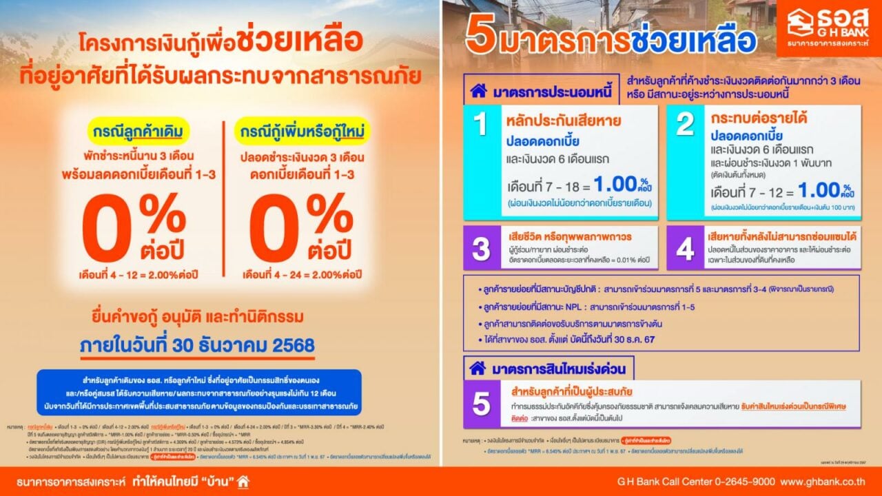 ทั้งนี้ ลูกค้าสามารถติดต่อได้ที่สาขาของ ธอส. ตั้งแต่วันนี้ถึงวันที่ 30 ธันวาคม 2568 ส่วนลูกค้าที่ประสงค์ขอรับบริการ “5 มาตรการช่วยเหลือผู้ประสบภัยพิบัติทางธรรมชาติ ปี 2567” มาตรการที่ 1-4 สามารถติดต่อได้ที่สาขาของ ธอส. ตั้งวันนี้ถึงวันที่ 30 ธันวาคม 2567 และมาตรการที่ 5 ติดต่อได้ที่สาขาของ ธอส. ตั้งแต่วันนี้เป็นต้นไป โทร. 0-2645-9000