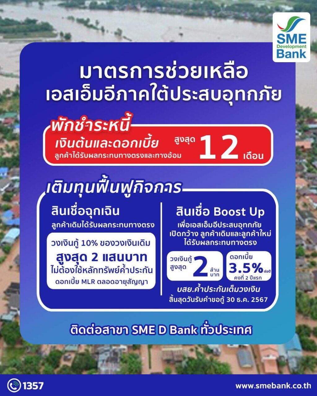 3. “สินเชื่อ Boost Up เพื่อเอสเอ็มอีประสบอุทกภัย” เปิดกว้างทั้งลูกค้าเดิมและลูกค้าใหม่ที่ได้รับผลกระทบจากอุทกภัยทางตรง ซึ่งมีสถานประกอบการอยู่ในพื้นที่ตามประกาศของกรมป้องกันและบรรเทาสาธารณภัย (ปภ.) เพื่อลงทุน ปรับปรุง หรือหมุนเวียนเสริมสภาพคล่อง เพื่อฟื้นฟูกิจการ วงเงินกู้สูงสุด 2 ล้านบาท (รวมทุกสถาบันการเงินสูงสุดไม่เกิน 40 ล้านบาท) อัตราดอกเบี้ย 3.50% ต่อปี คงที่ 2 ปีแรก ส่วนปีที่ 3 เป็นต้นไป MLR +1.5% ต่อปี ระยะเวลาผ่อนนานสูงสุด 5 ปี ปลอดชำระเงินต้นสูงสุด 12 เดือน หลักประกัน ใช้ บสย. ค้ำประกันได้เต็มวงเงิน สิ้นสุดวันรับคำขอกู้ภายใน 30 ธันวาคม 2567 หรือจนกว่าจะเต็มวงเงินของโครงการ