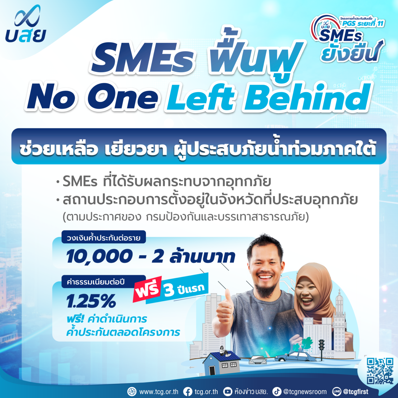 บสย. เดินหน้ามาตรการช่วยเหลือภาคใต้ด้วยมาตรการเสริมสภาพคล่อง โครงการค้ำประกันสินเชื่อดอกเบี้ยถูก SMEs ฟื้นฟู No One Left Behind วงเงิน 1,000 ล้านบาท ภายใต้โครงการค้ำประกันสินเชื่อ PGS 11 “บสย. SMEs ยั่งยืน” ค้ำประกันตั้งแต่ 1 หมื่น-2 ล้านบาทต่อราย นานสูงสุด 10 ปี อัตราค่าธรรมเนียม 1.25% ต่อปี ฟรี! ค่าธรรมเนียม 3 ปีแรก พร้อมยกเว้นค่าดำเนินการค้ำประกันตลอดโครงการ โดยเปิดรับคำขอค้ำประกันตั้งแต่วันนี้ ถึง 30 เมษายน 2568