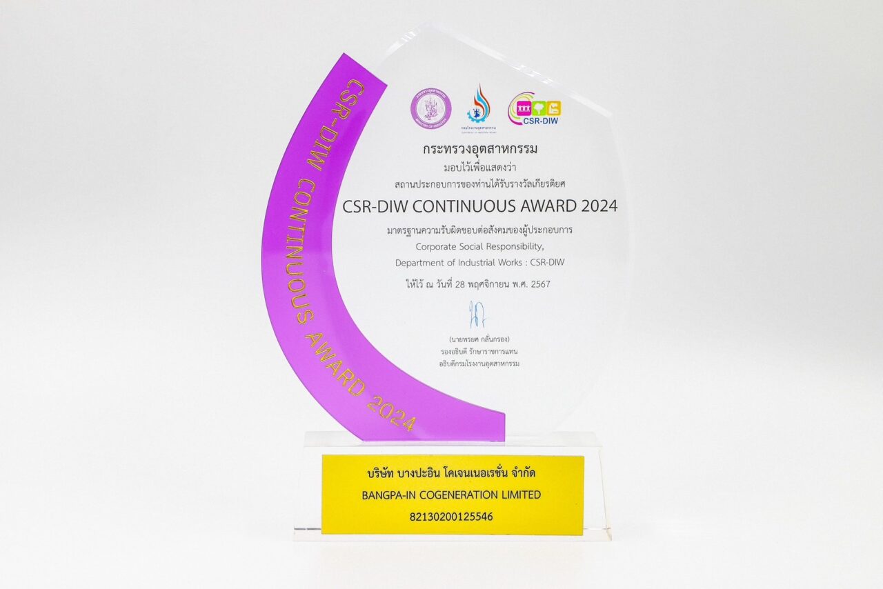 เมื่อเร็วๆ นี้ บริษัท โรงไฟฟ้าบางปะอิน โคเจนเนอเรชั่น จำกัด (BIC) บริษัทในเครือบริษัท ซีเค พาวเวอร์ จำกัด (มหาชน) หนึ่งในผู้นำการผลิตไฟฟ้าจากพลังงานหมุนเวียนที่ใหญ่ที่สุดในภูมิภาคและมีคาร์บอนฟุตพรินต์ต่ำที่สุดรายหนึ่ง รับโล่รางวัลและเกียรติบัตร CSR DIW Continuous Award ประจำปี 2567 จากกรมโรงงานอุตสาหกรรม กระทรวงอุตสาหกรรม ซึ่งมอบให้สถานประกอบการที่ให้ความสำคัญในการส่งเสริมสนับสนุนการดำเนินงาน และปฏิบัติตามมาตรฐานความรับผิดชอบต่อสังคม (Corporate Social Responsibility: CSR) ได้อย่างครบถ้วน โดยมีนายเดชา จันทวี ผู้จัดการโรงไฟฟ้า เป็นตัวแทนรับโล่รางวัลจาก นายสุนทร แก้วสว่าง รองอธิบดีกรมโรงงานอุตสาหกรรม กระทรวงอุตสาหกรรม ณ ห้องรอยัล จูบิลี่ บอลรูม อาคาร ชาเลนเจอร์ อิมแพ็ค เมืองทองธานี จังหวัดนนทบุรี