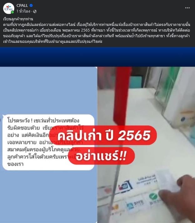 เมื่อวันที่ 22 ธ.ค. ผู้สื่อข่าวรายงานว่า เพจเฟซบุ๊ก “CPALL” โพสต์ภาพพร้อมข้อความระบุว่า “เรียนลูกค้าทุกท่าน ตามที่ปรากฏคลิปและข้อความส่งต่อทางไลน์ เรื่องผู้ใช้บริการท่านหนึ่งแจ้งเรื่องป้ายราคาสินค้าไม่ตรงกับราคาขายนั้น เป็นคลิปเหตุการณ์เก่า เมื่อช่วงเดือน พฤษภาคม 2565 ที่ผ่านมา