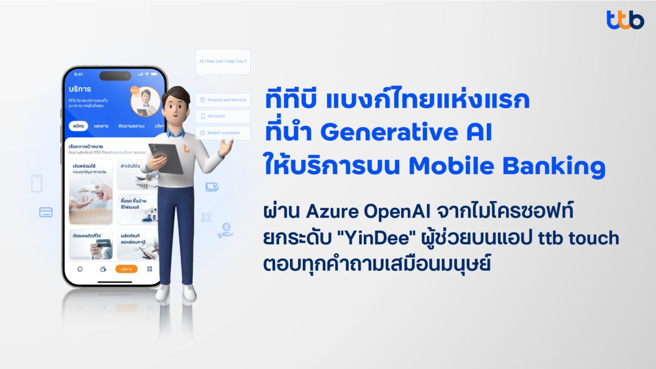 ทีทีบี แบงก์ไทยแห่งแรกนำ Generative AI ให้บริการ Mobile Banking ด้วย Azure OpenAI จากไมโครซอฟท์ ยกระดับ "ยินดี-Yindee" ผู้ช่วยบนแอป ttb touch เข้าใจภาษามนุษย์ตอบทุกคำถามได้เร็ว-แม่นยำมากขึ้น