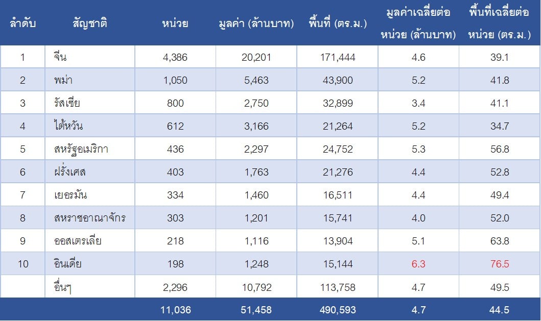 เปิด TOP10 ชาวต่างชาติ ซื้อคอนโดในไทยสูงสุดรอบ 9 เดือน เงินสะพัด 5 หมื่นล้าน จีนมาอันดับหนึ่ง เศรษฐีอินเดียมาแรง ซื้อห้องหรู 6.3 ล้าน