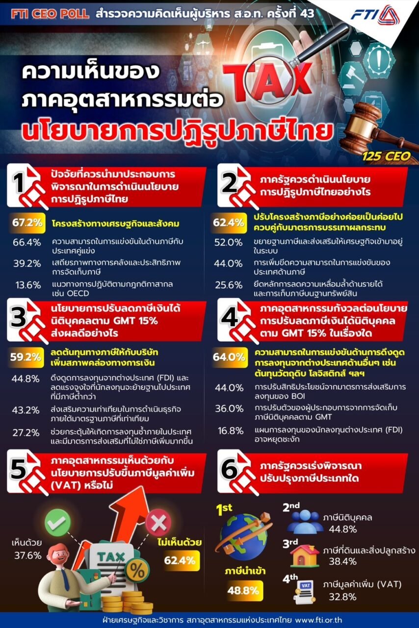 หม่อมหลวงปีกทอง ทองใหญ่ รองประธานสภาอุตสาหกรรมแห่งประเทศไทย (ส.อ.ท.) เปิดเผยผลการสำรวจ FTI CEO Poll ครั้งที่ 43 ในเดือนมกราคม 2568 ภายใต้หัวข้อ “ความเห็นต่อนโยบายการปฏิรูปภาษีไทย” พบว่า ผู้บริหาร ส.อ.ท. ส่วนใหญ่ เห็นด้วยหากภาครัฐดำเนินการปรับโครงสร้างภาษีนำเข้าก่อน เพื่อรักษาขีดความสามารถในการแข่งขันของผู้ผลิตในประเทศ และเตรียมความพร้อมรับมือผลกระทบทั้งทางตรงและทางอ้อมจากสงครามการค้าที่คาดว่าจะมีแนวโน้มรุนแรงมากขึ้น ขณะที่การปรับภาษีมูลค่าเพิ่ม (VAT) ในช่วงเวลานี้ ส่วนใหญ่ยังไม่เห็นด้วย