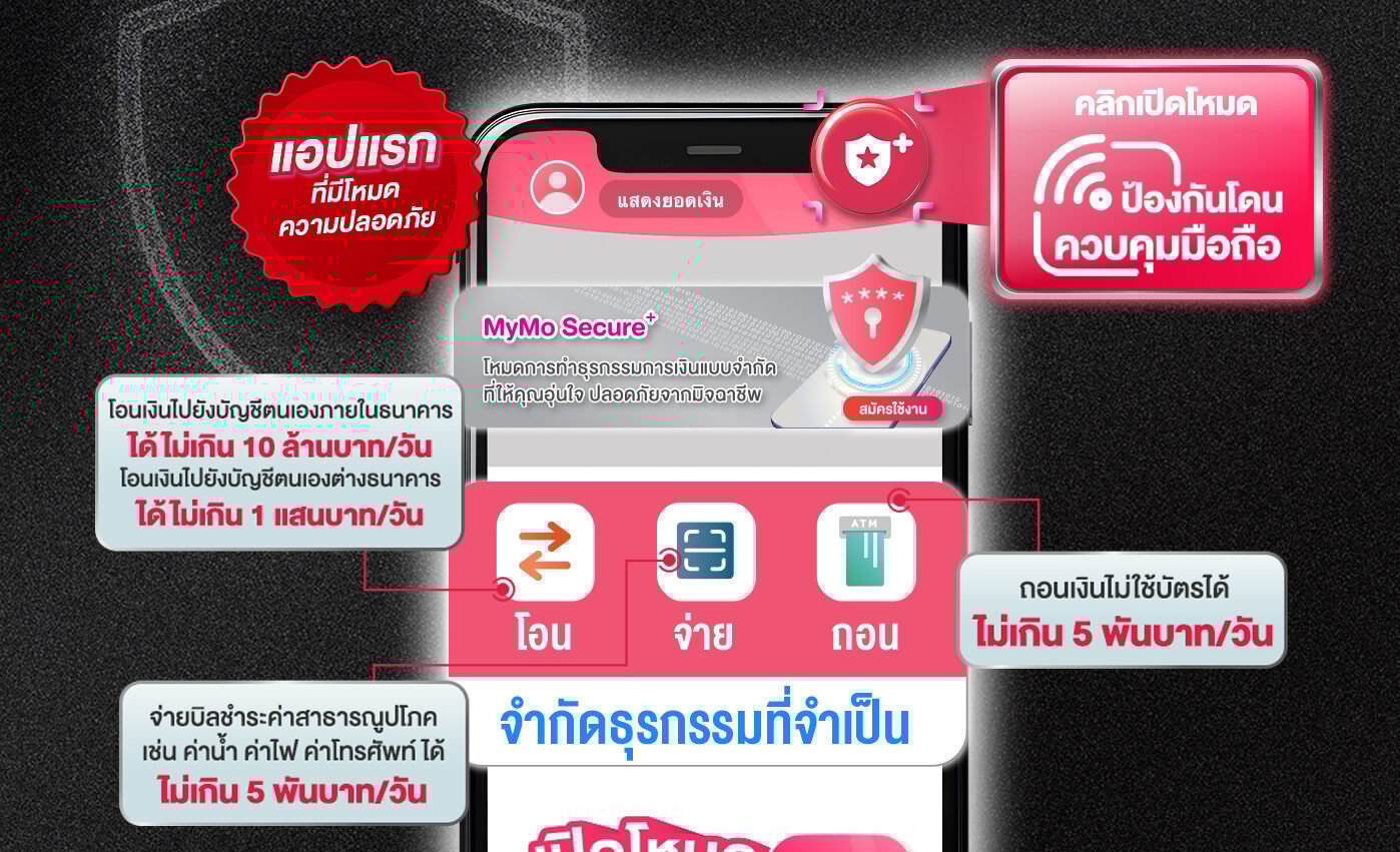 ออมสิน ชวนใช้ MyMo Secure Plus ป้องกันถูกมิจฉาชีพดูดเงินออกจากแอป เหมาะกับผู้สูงวัยและลูกค้าที่เน้นฝากเงิน ไม่เน้นทำธุรกรรม ให้เงินฝากปลอดภัยขั้นสุด