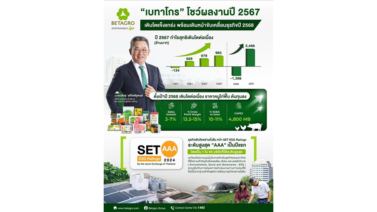 “เบทาโกร” โชว์ผลงานปี 2567 เติบโตแข็งแกร่ง พร้อมเดินหน้าขับเคลื่อนธุรกิจปี 2568 ทุ่มงบลงทุน 4,800 ล้านบาท ตั้งเป้ารายได้เติบโต 3-7%