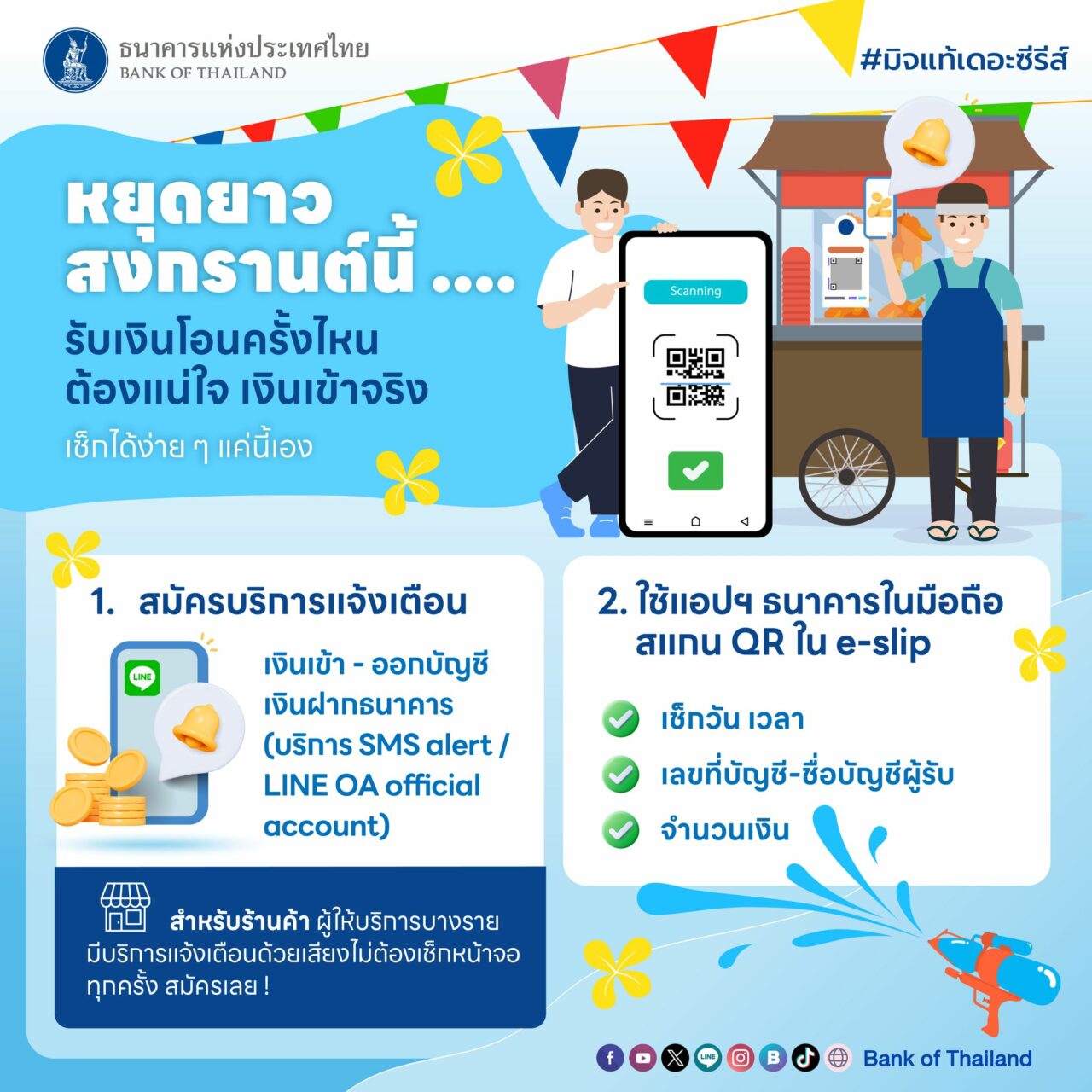 แบงก์ชาติ เตือนสงกรานต์นี้ รับเงินโอนครั้งไหน ต้องแน่ใจ เงินเข้าจริง แต่ไม่ว่าจะเทศกาลไหน ก็อย่าให้ถูกหลอก รอบคอบ เช็กให้ดี ทุกครั้งที่รับโอนเงินก่อน