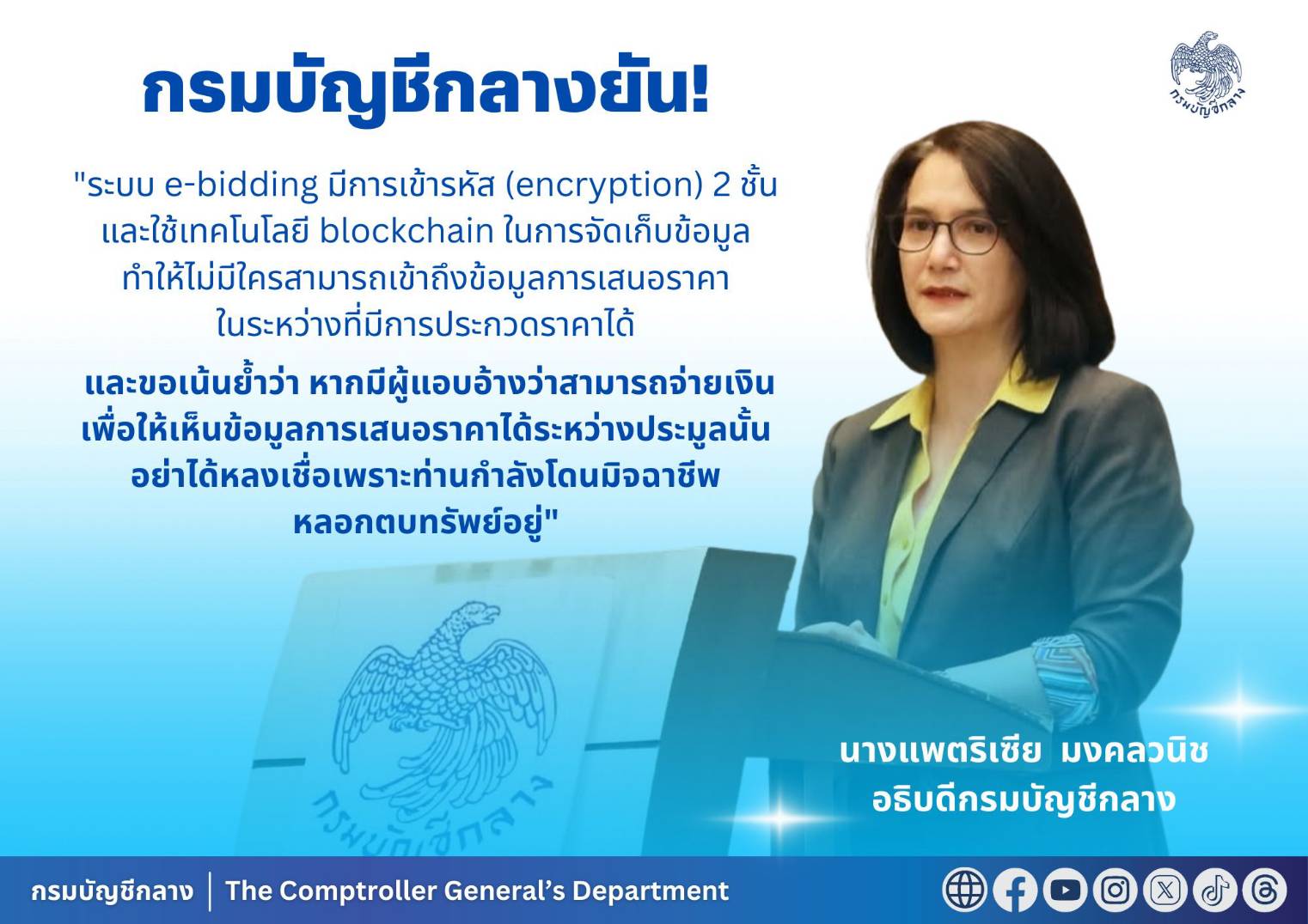 กรมบัญชีกลางขอยืนยันว่า เจ้าหน้าที่กรมบัญชีกลางไม่มีส่วนเกี่ยวข้องในการเปิดเผยข้อมูลการเสนอราคา e-bidding ของโครงการดังกล่าวตามที่มีการกล่าวอ้าง หรือโครงการประมูลใดของภาครัฐ นอกจากนี้กรมบัญชีกลางได้มีการยกระดับการเพิ่มประสิทธิภาพระบบรักษาความปลอดภัยของระบบ e-bidding โดยมีการเข้ารหัส (encryption) 2 ชั้น และใช้เทคโนโลยี blockchain ในการจัดเก็บข้อมูล ทำให้ไม่มีใครสามารถเข้าถึงข้อมูลการเสนอราคาในระหว่างที่มีการประกวดราคาได้ และเมื่อระยะเวลาการเสนอราคาสิ้นสุดลง ระบบจะแสดงให้ทราบถึงข้อมูลการเสนอราคาต่ำสุดในโครงการนั้นๆ ทั้งนี้ ขอเน้นย้ำว่าหากมีผู้แอบอ้างว่าสามารถจ่ายเงินเพื่อให้เห็นข้อมูลการเสนอราคาได้ระหว่างประมูลนั้น อย่าได้หลงเชื่อ เพราะท่านกำลังโดนมิจฉาชีพหลอกตบทรัพย์อยู่ อธิบดีกรมบัญชีกลาง กล่าว