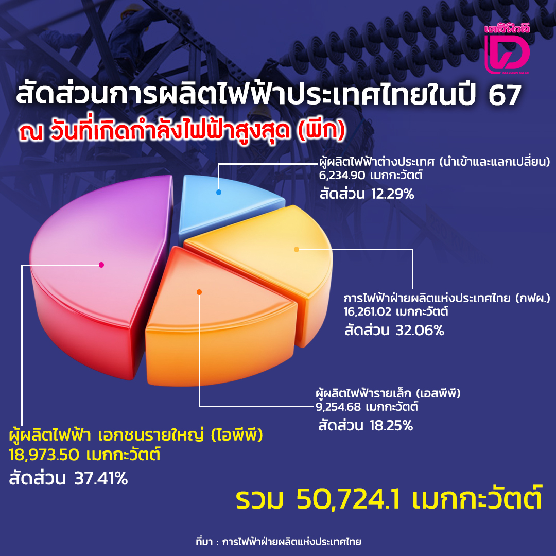 สำหรับ สัดส่วนการผลิตไฟฟ้าล่าสุดของประเทศไทยในปี 67 ณ วันที่เกิดกำลังไฟฟ้าสูงสุด (พีก)