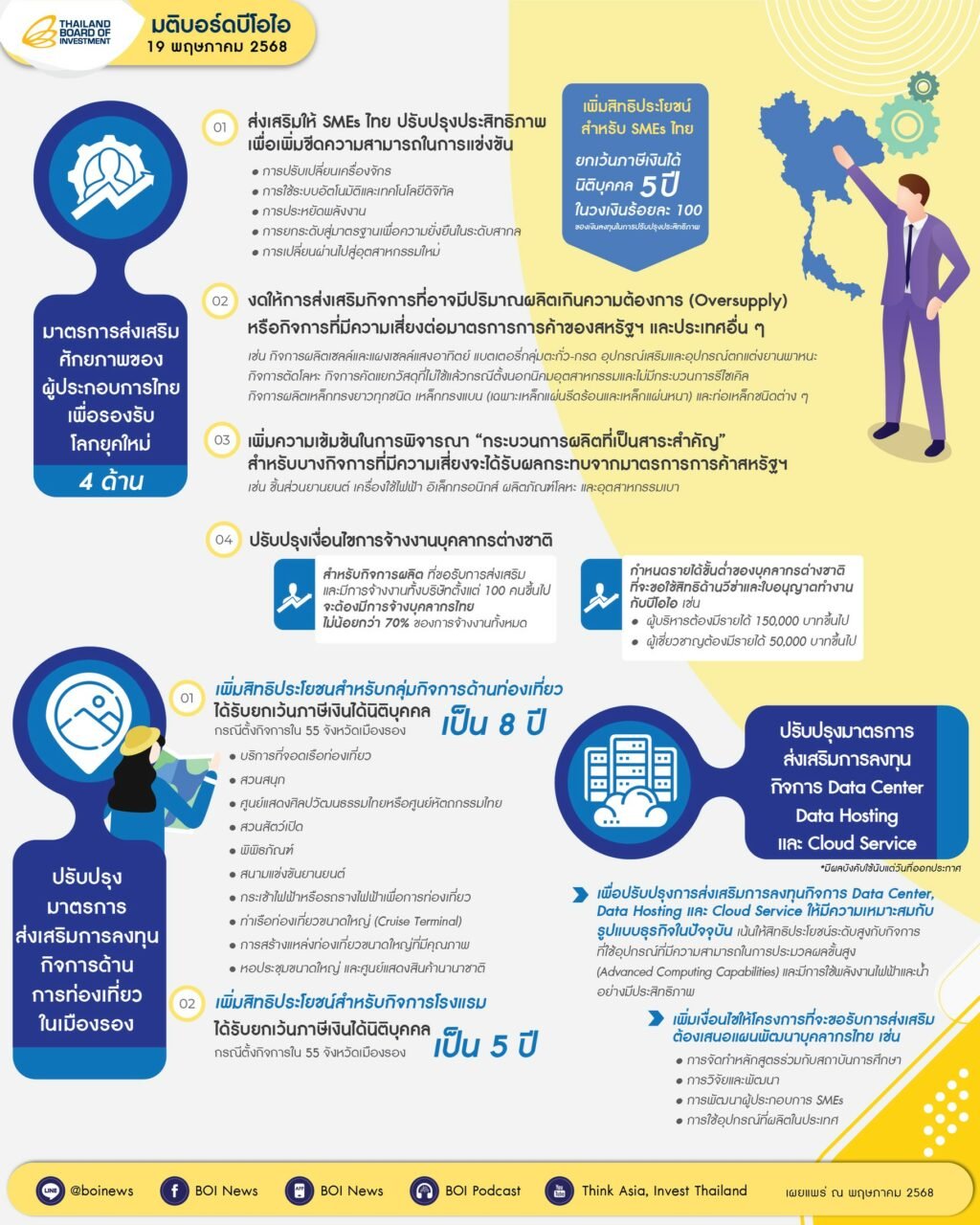 บอร์ดบีโอไอ ได้อนุมัติการปรับปรุงการส่งเสริมการลงทุนกิจการ Data Center,Data Hosting และ Cloud Service ให้มีความเหมาะสมกับรูปแบบธุรกิจในปัจจุบัน โดยจะเน้นให้สิทธิประโยชน์ระดับสูงกับกิจการที่ใช้อุปกรณ์ที่มีความสามารถในการประมวลผลขั้นสูง (Advanced Computing Capabilities) และมีการใช้พลังงานไฟฟ้าและน้ำอย่างมีประสิทธิภาพ อีกทั้งได้เพิ่มเงื่อนไขให้โครงการที่จะขอรับการส่งเสริม ต้องเสนอแผนพัฒนาบุคลากรไทย เช่น การจัดทำหลักสูตรร่วมกับสถาบันการศึกษา การวิจัยและพัฒนา การพัฒนาผู้ประกอบการ SMEs หรือการใช้อุปกรณ์ที่ผลิตในประเทศ โดยต้องดำเนินการตามแผนที่เสนอให้แล้วเสร็จก่อนการใช้สิทธิประโยชน์ยกเว้นภาษีเงินได้ ทั้งนี้ เพื่อให้การลงทุนในกลุ่มธุรกิจนี้เกิดประโยชน์ในการพัฒนาบุคลากรด้านดิจิทัลแก่ประเทศไทยให้เป็นรูปธรรมมากยิ่งขึ้น