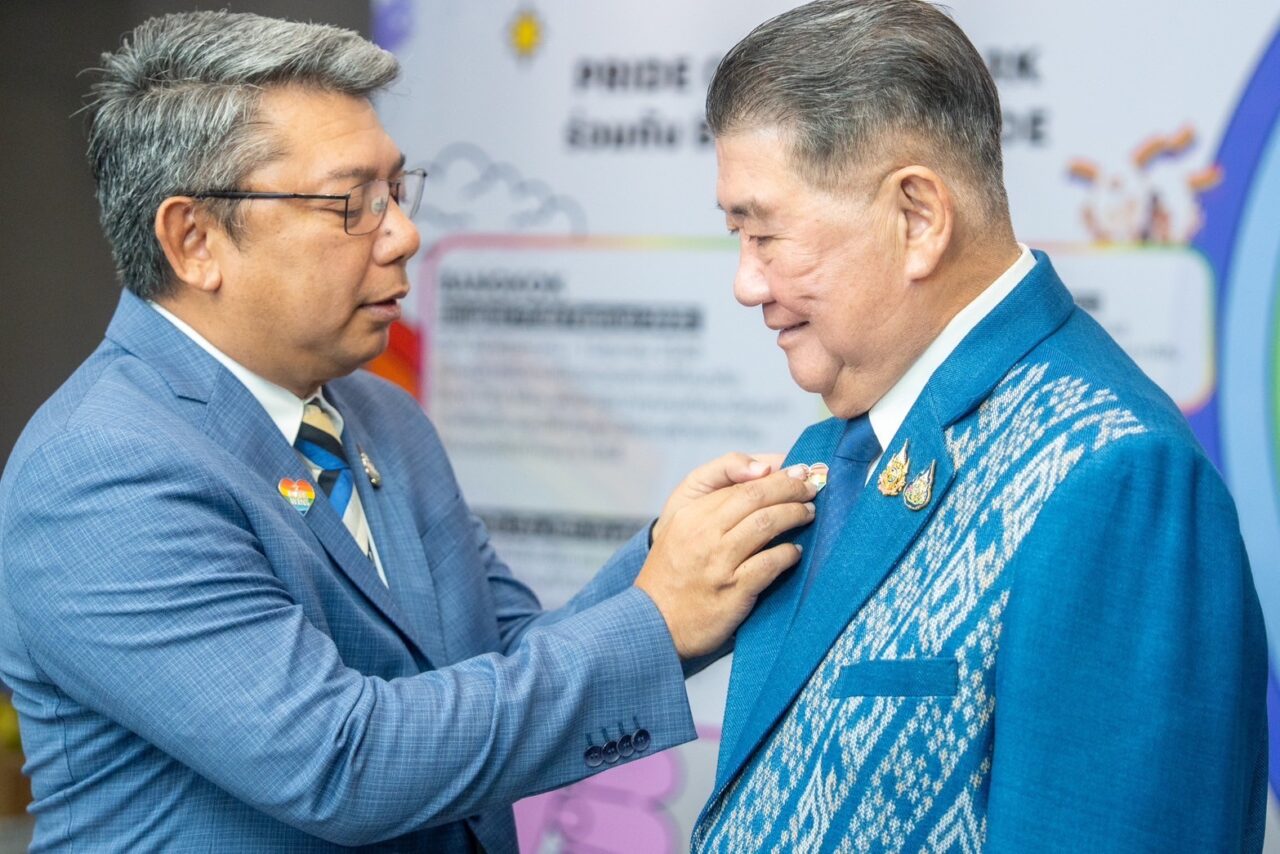 นายนิธี สีแพร รองผู้ว่าการด้านสื่อสารการตลาด การท่องเที่ยวแห่งประเทศไทย (ททท.) มอบเข็มกลัดที่ระลึกงาน Pride Month ให้นายภูมิธรรม เวชยชัย รองนายกรัฐมนตรีและรมว.กลาโหม