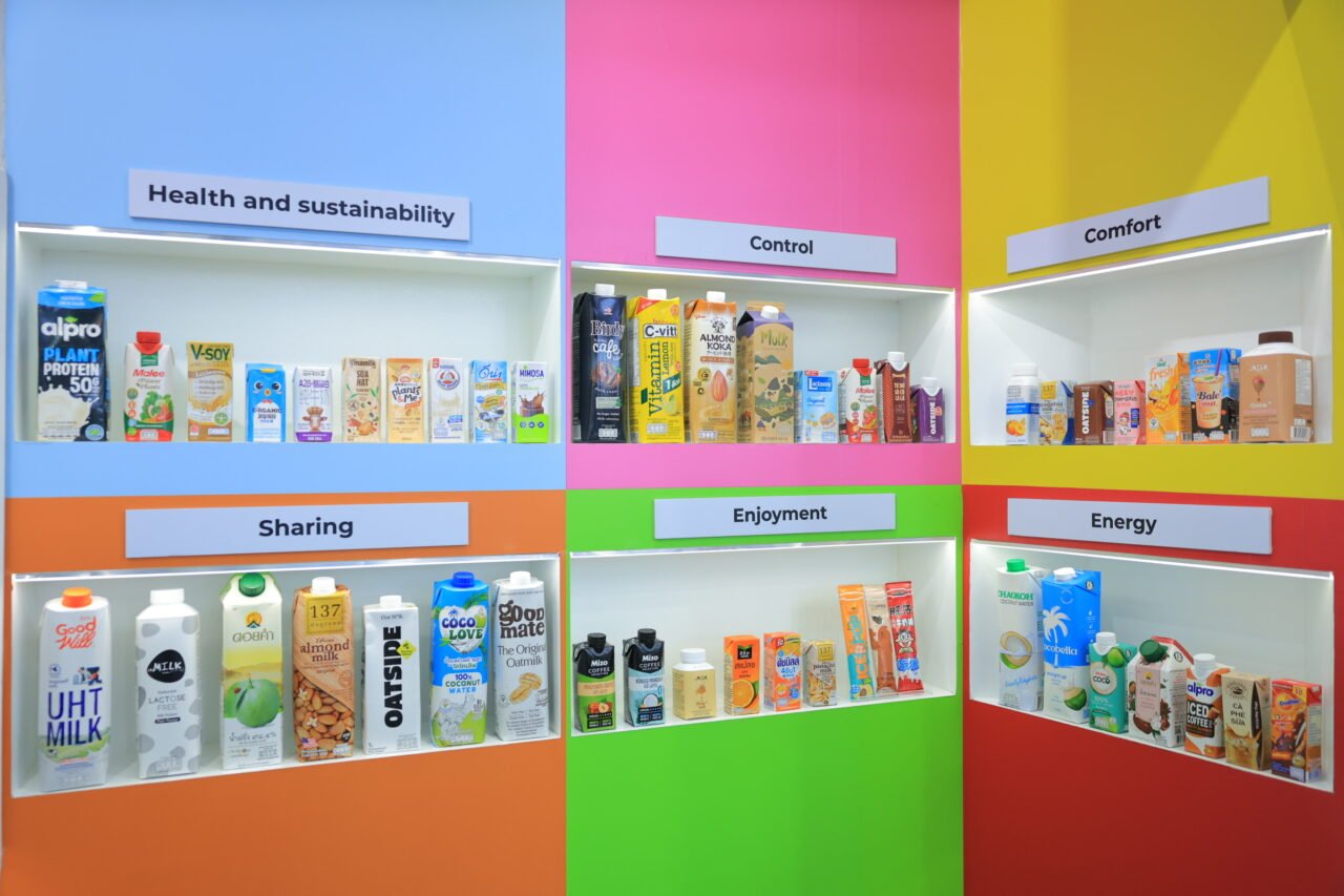 โซนDifferentiate to Stand outเน้นนวัตกรรมบรรจุภัณฑ์กล่องกระดาษแบบปลอดเชื้อของเต็ดตรา แพ้ค ไม่ว่าจะเป็น Tetra Prisma® Aseptic ที่เหมาะสำหรับเครื่องดื่มแบบพรีเมียมที่เน้นพกพาสะดวก และ Tetra Recart® ที่เหมาะสำหรับผลิตภัณฑ์อาหาร มีจุดเด่นที่น้ำหนักเบา ใช้งานสะดวก ช่วยรักษาสิ่งแวดล้อม และยังเหมาะกับทุกช่องทางค้าปลีก นอกจากนี้ ยังมีการเสนอกล่องบรรจุภัณฑ์และฝาที่ทำจากพืชและวัสดุชีวภาพที่ช่วยให้แบรนด์สามารถยกระดับประสบการณ์ให้กับผู้บริโภค พร้อมตอบสนองต่อความท้าทายด้านสิ่งแวดล้อมควบคู่กันไป