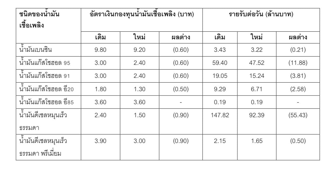 สำหรับมติกบน.ให้ปรับลดอัตราเงินส่งเข้ากองทุนน้ำมันเชื้อเพลิงสำหรับน้ำมันเบนซิน และน้ำมันดีเซล เช่น น้ำมันเบนซิน ลดการจัดเก็บลงลิตรละ 0.60 บาท น้ำมันแก๊สโซออล์ 95 ลดการจัดเก็บลงลิตรละ 0.60 บาท น้ำมันแก๊สโซออล์ 91 ลดการจัดเก็บลงลิตรละ 0.60 บาท น้ำมันดีเซล ลดการจัดเก็บลงลิตรละ 0.90 บาท โดยใช้กลไกอัตราเงินกองทุนน้ำมันฯ เข้ามาช่วยรักษาเสถียรภาพ และพยุงราคาน้ำมันในประเทศ ไม่ให้กระทบกับความต่อเนื่องในการบริหารจัดการกองทุนน้ำมันฯ ในระยะยาว
