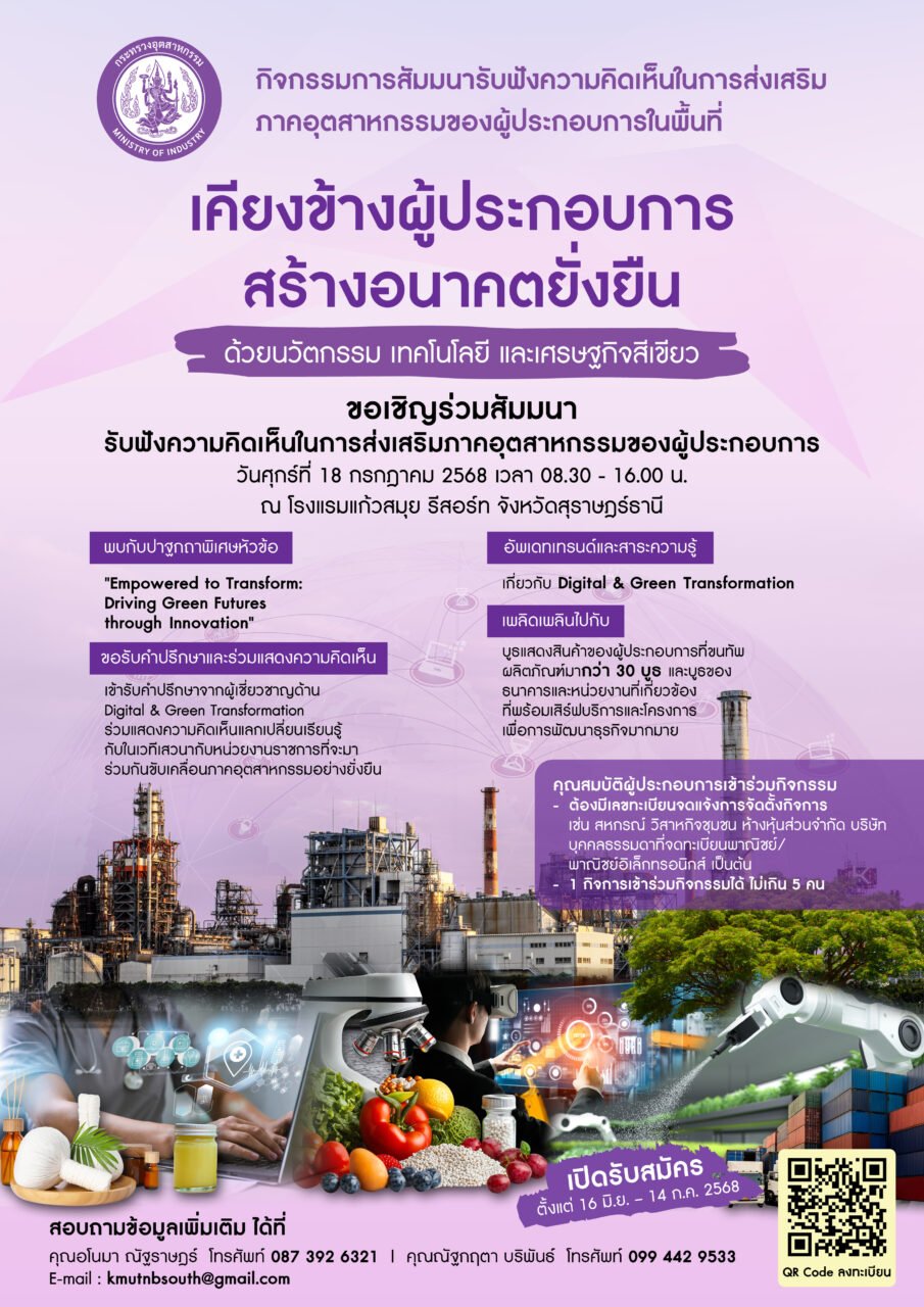 กระทรวงอุตสาหกรรม เดินหน้ายกศักยภาพภาคอุตสาหกรรม เตรียมจัดสัมมนารับฟังความคิดเห็นในการส่งเสริมภาคอุตสาหกรรมของผู้ประกอบการในพื้นที่ จังหวัดสุราษฎร์ธานี ภายใต้หัวข้อ “เคียงข้างผู้ประกอบการ สร้างอนาคตยั่งยืน“ ด้วยนวัตกรรม เทคโนโลยี และเศรษฐกิจสีเขียว ณ โรงแรมแก้วสมุยรีสอร์ท จังหวัดสุราษฎร์ธานี ในวันศุกร์ที่ 18 กรกฎาคม 2568 คาดมีผู้ประกอบการเข้าร่วมกว่า 500 ราย เปิดรับสมัครแล้ววันนี้ ถึง14 กรกฎาคม 2568