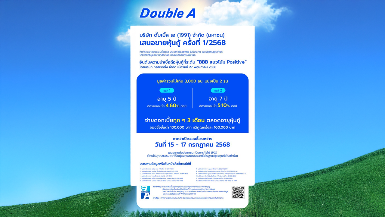 บริษัท ดั๊บเบิ้ล เอ (1991) จำกัด (มหาชน) เตรียมเสนอขายหุ้นกู้ครั้งที่ 1/2568 ซึ่งเป็นหุ้นกู้ระยะยาวชนิดระบุชื่อผู้ถือ ประเภทไม่ด้อยสิทธิ ไม่มีประกัน และมีผู้แทนผู้ถือหุ้นกู้ เปิดให้จองซื้อหุ้นกู้ระหว่างวันที่ 15-17 กรกฎาคม 2568