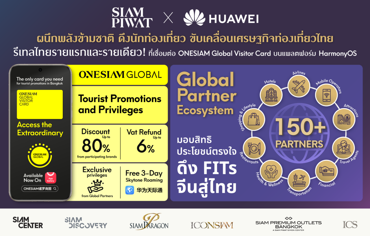 กลุ่มบริษัทสยามพิวรรธน์ ผู้พัฒนาอสังหาริมทรัพย์และธุรกิจค้าปลีกชั้นนำ ผู้บริหารโกลบอลเดสติเนชั่น สยามพารากอน สยามเซ็นเตอร์ สยามดิสคัฟเวอรี่ หนึ่งในพันธมิตรเจ้าของไอคอนสยาม และสยาม พรีเมี่ยม เอาท์เล็ต กรุงเทพ สร้างปรากฏการณ์ครั้งสำคัญในวงการค้าปลีกและอุตสาหกรรมการท่องเที่ยว ร่วมมือกับ “Huawei” ยักษ์ใหญ่ด้านเทคโนโลยีของโลก นำ ONESIAM Global Visitor Card บัตรที่มอบประสบการณ์สุดพิเศษให้กับนักท่องเที่ยวทั่วโลกที่มาเยือนประเทศไทย มาเชื่อมต่อผ่านระบบปฏิบัติการ HarmonyOS ของ Huawei ที่มีฐานผู้ใช้สมาร์ตโฟนกว่า 400 ล้านเครื่องทั่วประเทศจีน พร้อมต่อยอดไปสู่การสร้าง Global Partner Ecosystem แห่งประสบการณ์ระดับโลก ที่ตอบโจทย์ทุก Touchpoint ของนักเดินทางคุณภาพอย่างแท้จริง ตอกย้ำการเป็นผู้นำในการสร้างประสบการณ์ระดับโลก และเป็น Global Destination ที่ยกระดับอุตสาหกรรมค้าปลีกไทย สร้างผลกระทบเชิงบวกต่อเศรษฐกิจไทยอย่างยั่งยืน