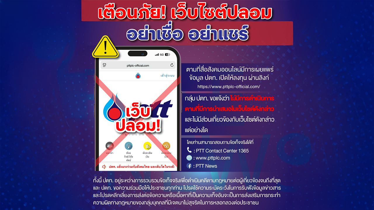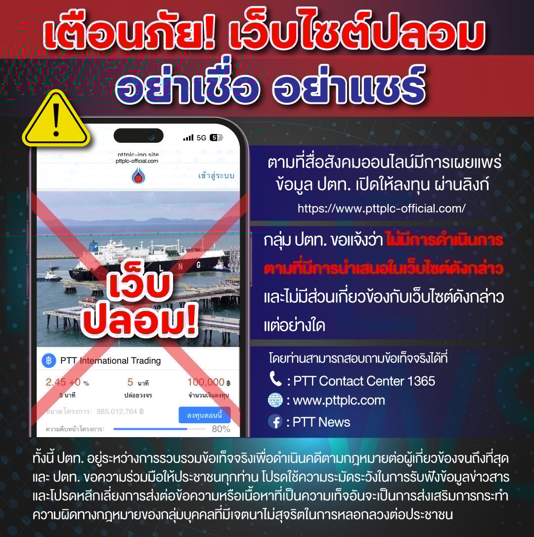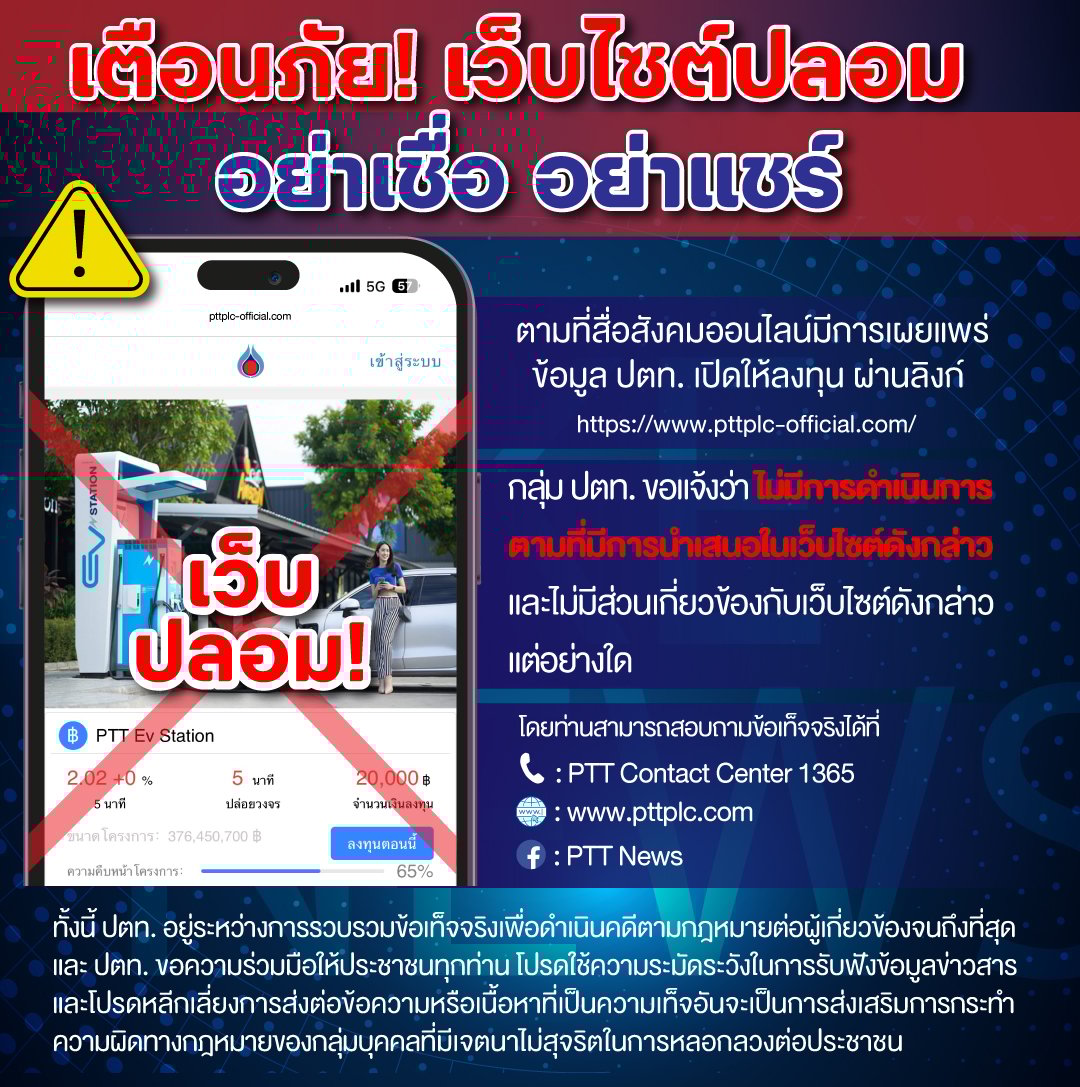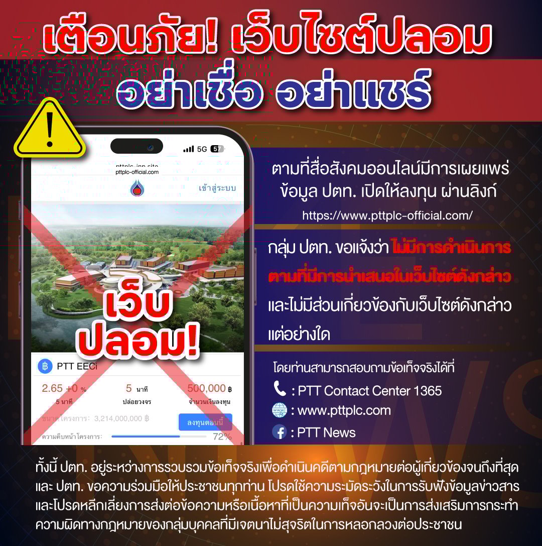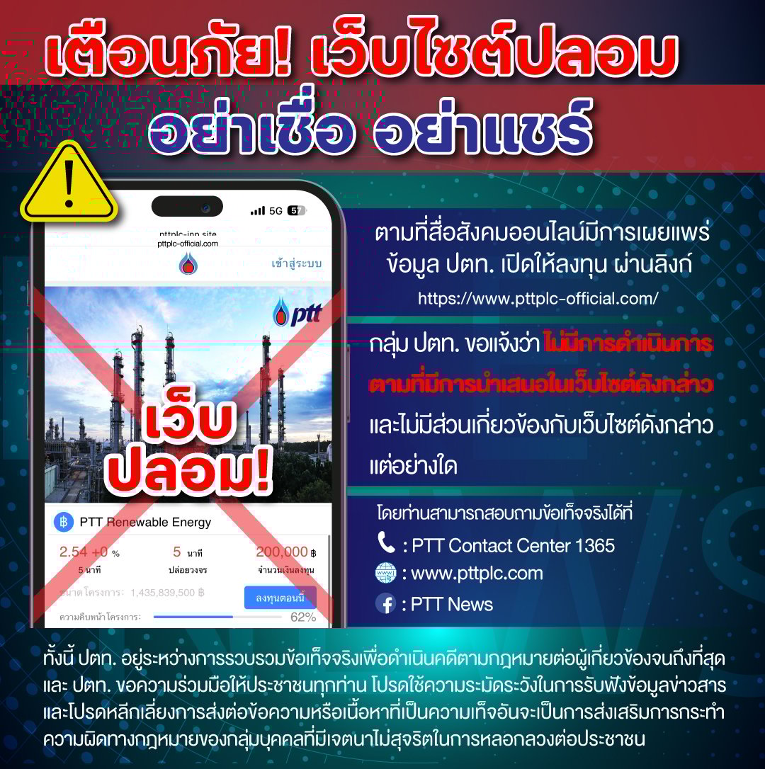 ตามที่สื่อสังคมออนไลน์มีการเผยแพร่ข้อมูล ปตท. เปิดให้ลงทุน ผ่านลิงก์ https://www.pttplc-official.com/ นั้น กลุ่ม ปตท. ขอแจ้งว่า กลุ่ม ปตท. ไม่มีการดำเนินการตามที่มีการนำเสนอในเว็บไซต์ดังกล่าว และไม่มีส่วนเกี่ยวข้องกับเว็บไซต์ดังกล่าวแต่อย่างใด โดยท่านสามารถสอบถามข้อเท็จจริงได้ที่ โทรศัพท์ PTT Contact Center 1365 และติดตามข่าวสารได้จากเวปไซต์ https://www.pttplc.com และ Facebook Fanpage : PTT News https://www.facebook.com/PTTNews