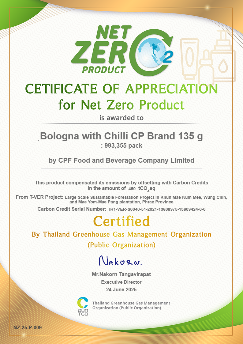 วิสัยทัศน์เป็น “ครัวของโลก” และนำแนวคิด Sustainovation หรือ นวัตกรรมที่ยั่งยืน ได้นำผลิตภัณฑ์ โบโลน่าพริก ซีพี ขนาด 135 และ 150 กรัม เข้ารับการรับรองฉลากผลิตภัณฑ์ปลอดคาร์บอน (Net Zero Product) จากองค์การบริหารจัดการก๊าซเรือนกระจก (องค์การมหาชน) หรือ อบก. โดยมี นายวิจารย์ สิมาฉายา ประธานกรรมการ อบก.ให้เกียรติมอบใบรับรอง และ นางสาว สลิลรัตน์ พงษ์พานิช ผู้อำนวยการอาวุโส ธุรกิจอาหารสำเร็จรูป ซีพีเอฟ เป็นตัวแทนของซีพีเอฟรับมอบฯ