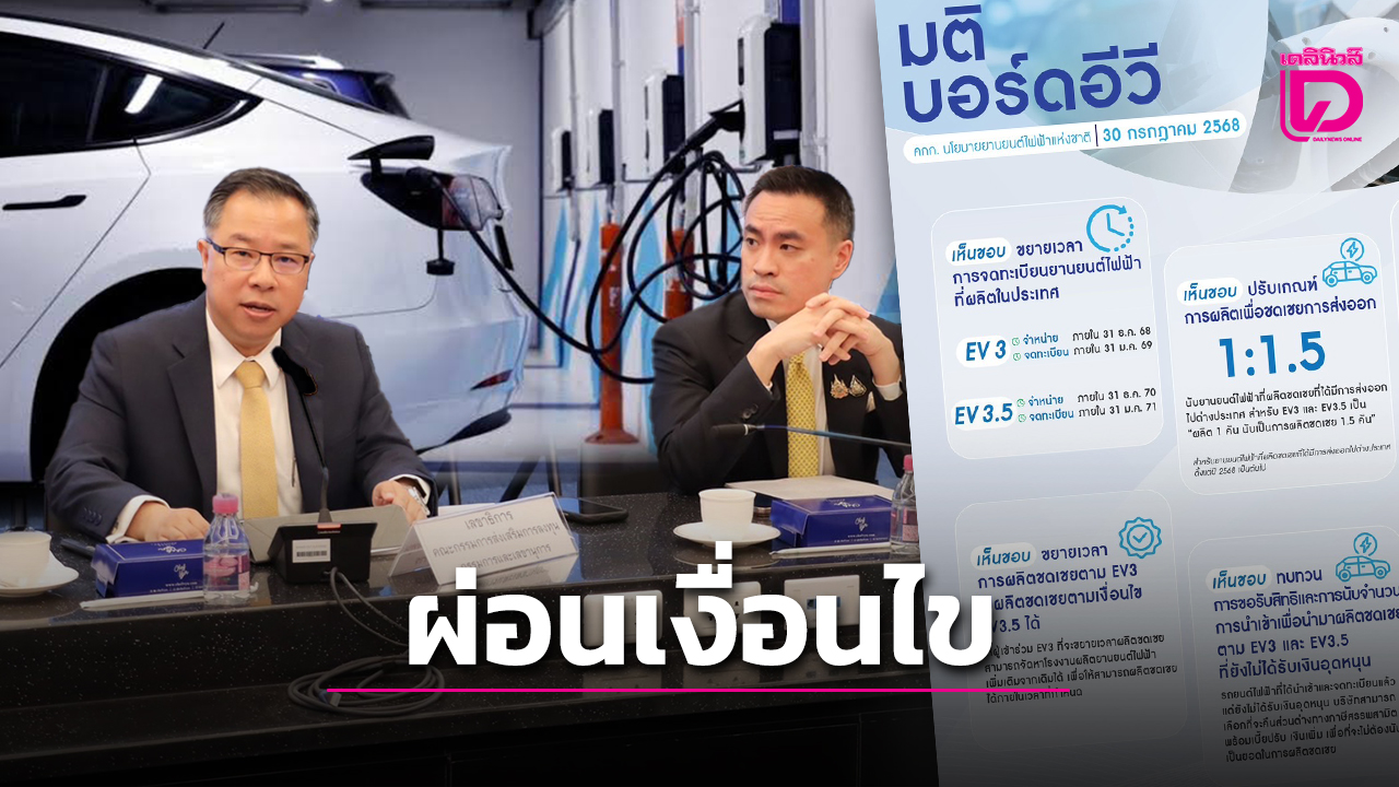 นอกจากนี้ เพื่อให้สอดคล้องกับกระบวนการจดทะเบียนยานยนต์ที่จำหน่ายในช่วงเวลาสิ้นปี บอร์ดอีวีได้เห็นชอบให้กรมสรรพสามิตขยายเวลาการจดทะเบียนยานยนต์ไฟฟ้าที่ผลิตในประเทศ ภายใต้มาตรการ EV3 และ EV3.5 ออกไปอีก 1 เดือน จากเดิมมาตรการ EV3 ให้จดทะเบียนภายในวันที่ 31 ธันวาคม 2568 เป็น “จำหน่ายภายในวันที่ 31 ธันวาคม 2568 และจดทะเบียนภายในวันที่ 31 มกราคม 2569” และมาตรการ EV3.5 จากเดิมให้จดทะเบียนภายในวันที่ 31 ธันวาคม 2570 เป็น “จำหน่ายภายในวันที่ 31 ธันวาคม 2570 และจดทะเบียนภายในวันที่ 31 มกราคม 2571”