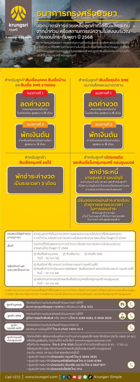 ติดต่อธนาคารกรุงศรีฯ แจ้งความประสงค์ขอรับมาตรการช่วยเหลือได้ที่สาขาของธนาคารกรุงศรีอยุธยาทั่วประเทศ หรือ Krungsri Call Center 1572 ตั้งแต่วันนี้ ถึง 30 ธันวาคม 2568 โดยเงื่อนไขและเกณฑ์การพิจารณาลูกค้าแต่ละรายเป็นไปตามหลักเกณฑ์ที่ธนาคารกำหนด ส่วนลูกค้าสินเชื่อธุรกิจ ขอรับมาตรการช่วยเหลือได้ที่ผู้จัดการธุรกิจสัมพันธ์ (Relationship Manager) หรือ สอบถามโทร. 02-296-6262 หรือ 02-626-2626 ตั้งแต่วันนี้ ถึง 30 ธันวาคม 2568